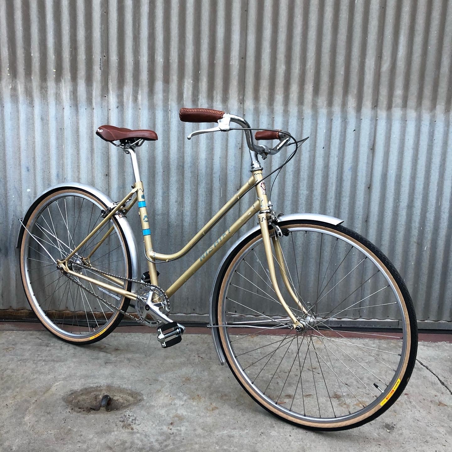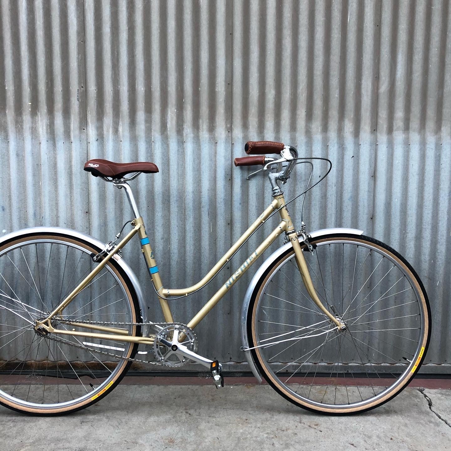 Nishiki step-through loving built by previous owner with cool stuff like VO fenders and dual pivot brakes. Awoke from a long slumber, we had to do lots of detailed cleaning and refurbishment on little stuff like replacing the chain ring bolts. Single speed, so this is a neighborhood cruiser