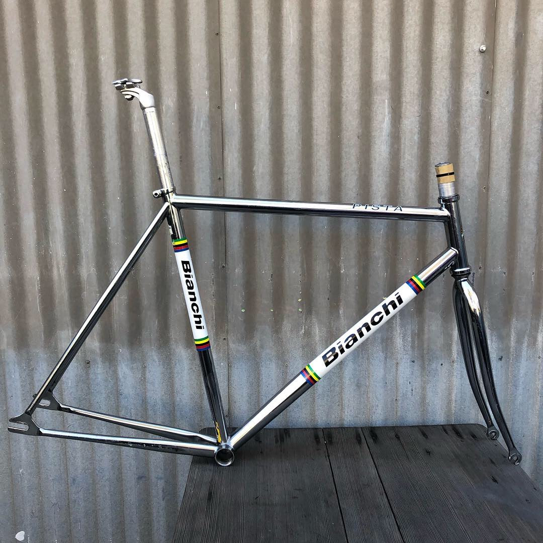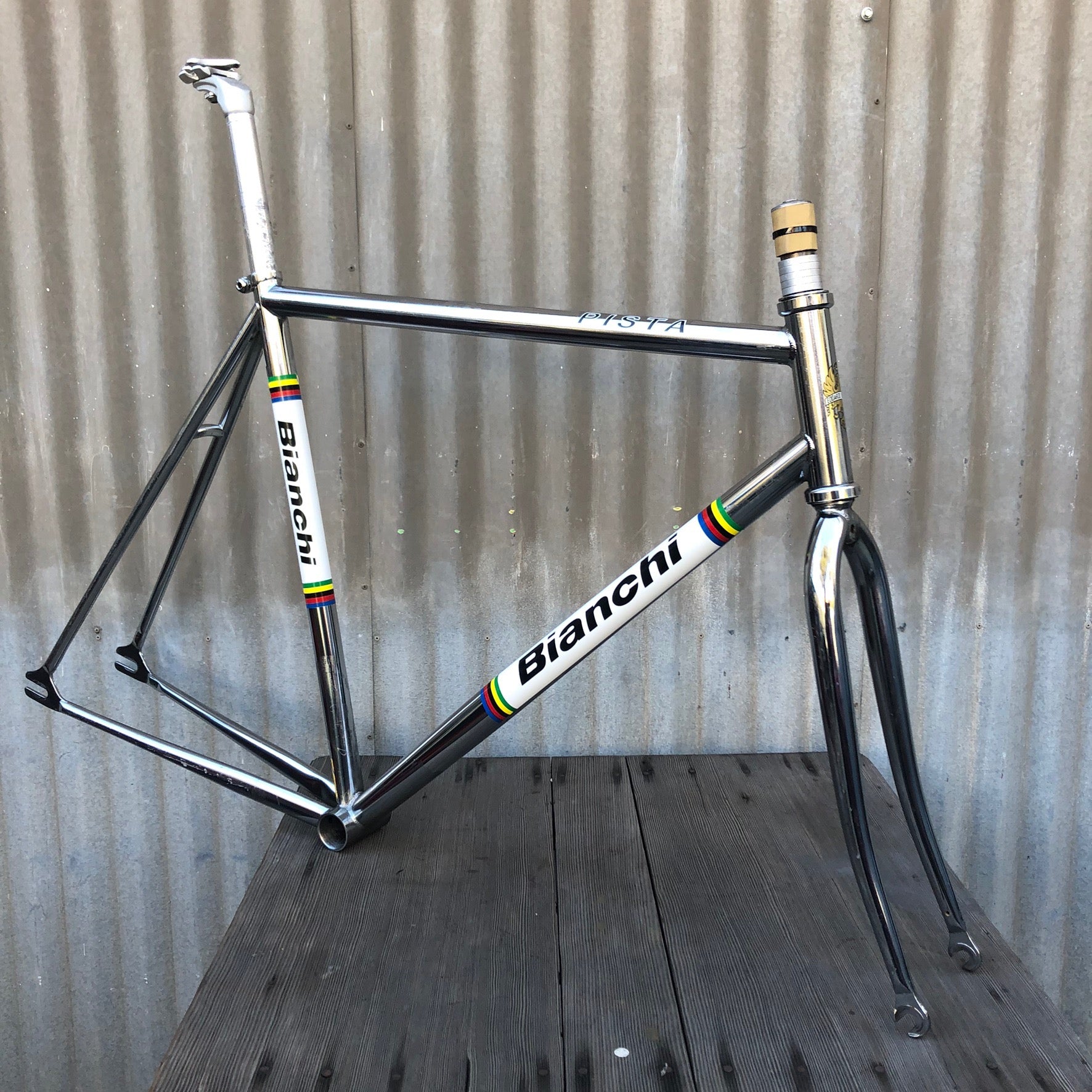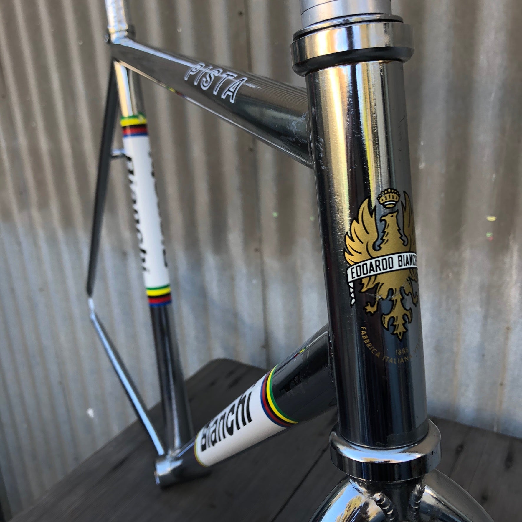 The desirable 55CM Bianchi Pista chrome track frame. Has facility for brakes. Some issues with clear coat and decals as seen in photos. Includes seatpost and VP head set.