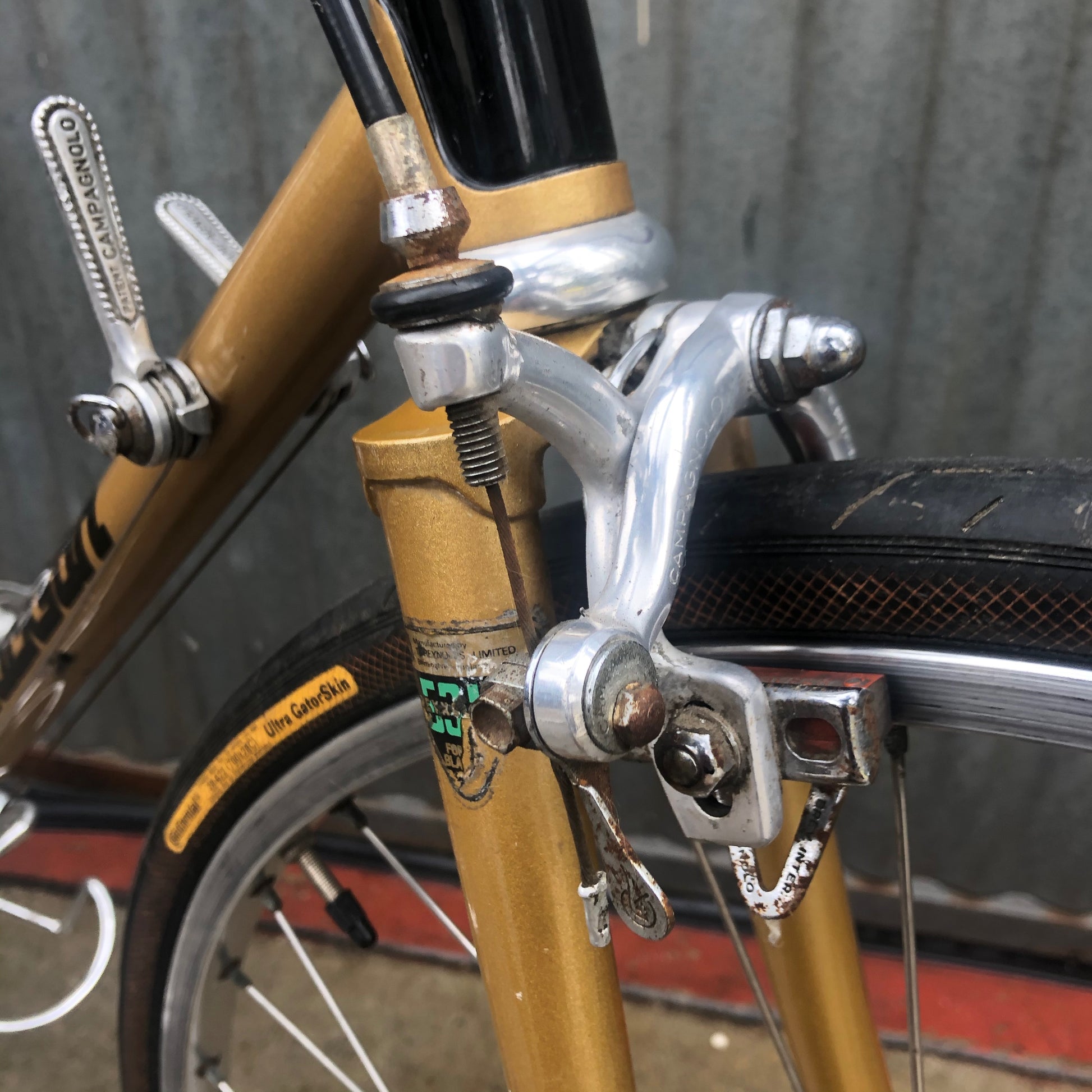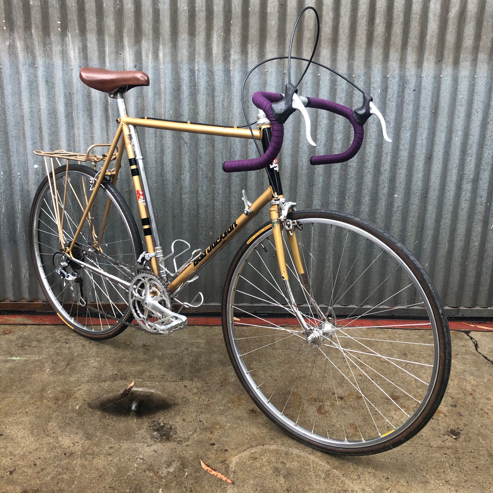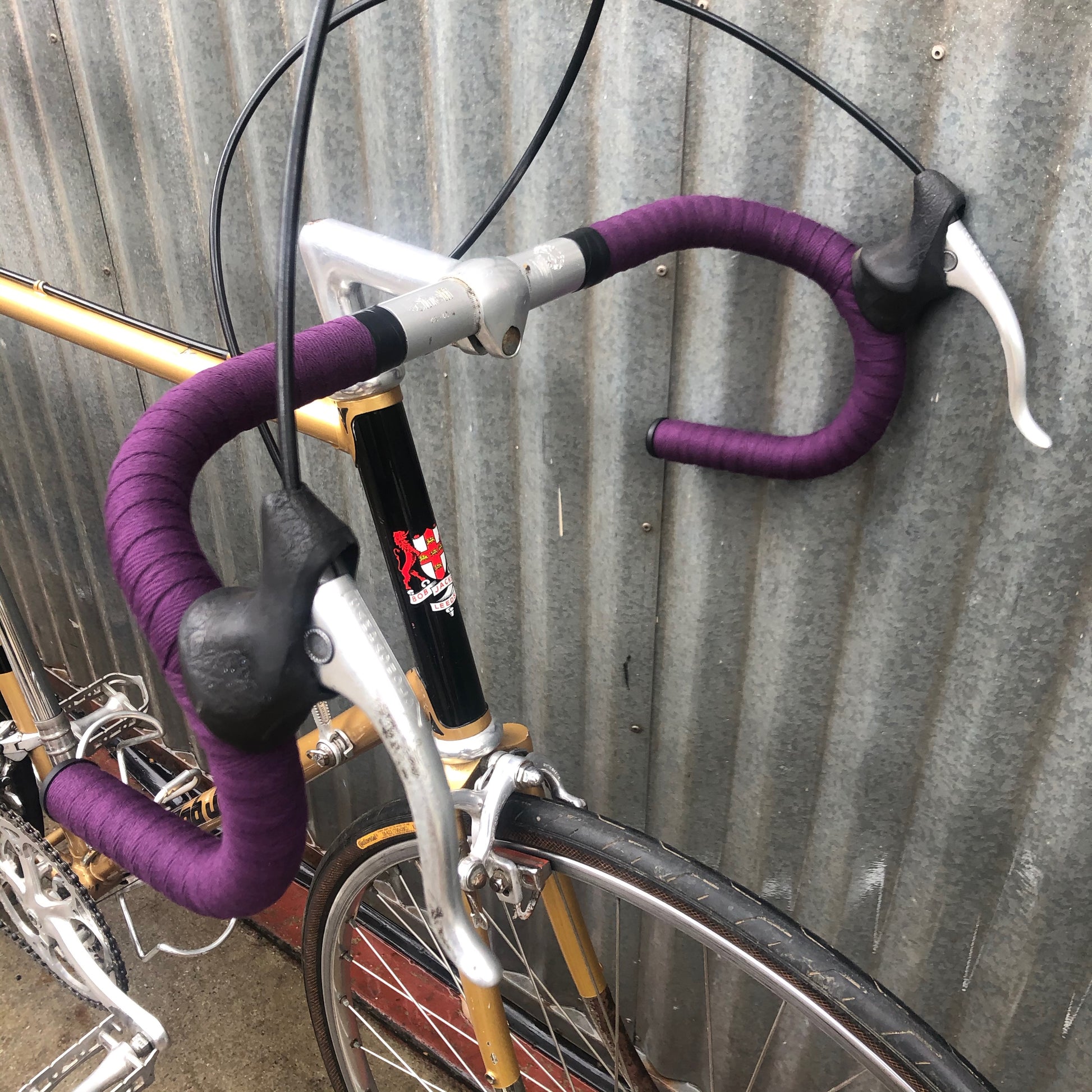 Bob Jackson sport touring project bike. Low rider fork braze-ons, neat Campy/Deore super wide range triple drivetrain. Appears to have had semi-recent service with Gatorskins and a newer Shimano freewheel. Cinelli cockpit. Chrome flaking from fork. Very early Chris King headset with crack in top cup. We cleaned up a little, tuned up, put on Newbaums eggplant tape. Spoke nipples are quite corroded. Reynolds 531.
