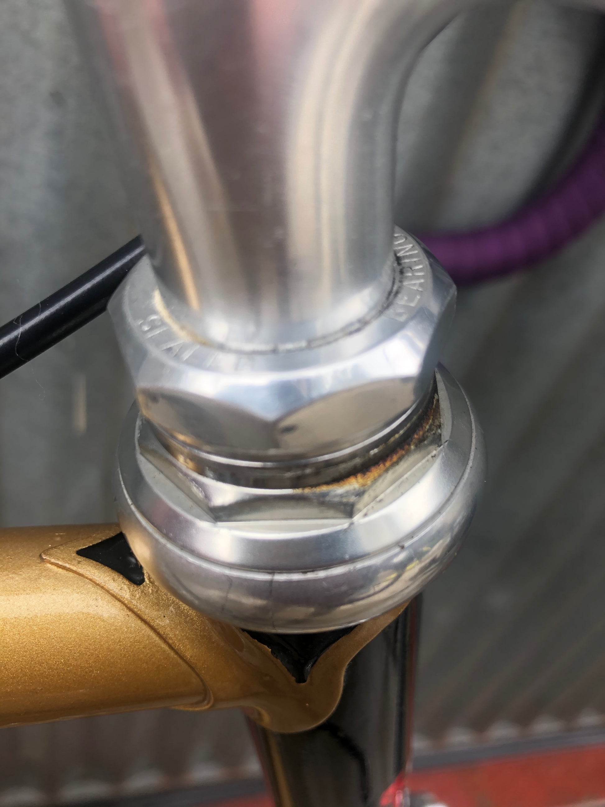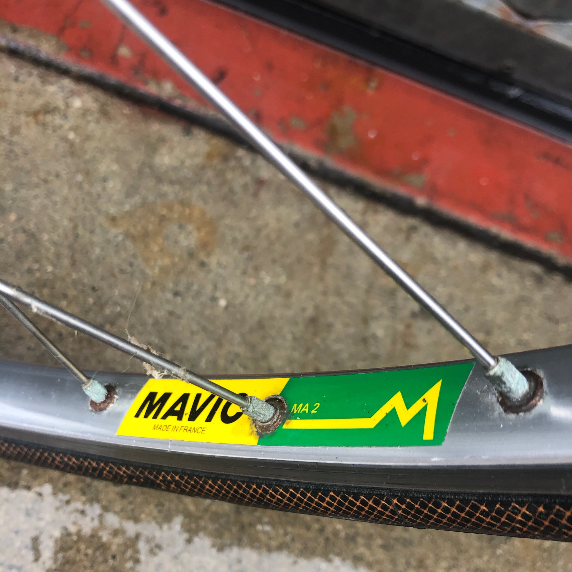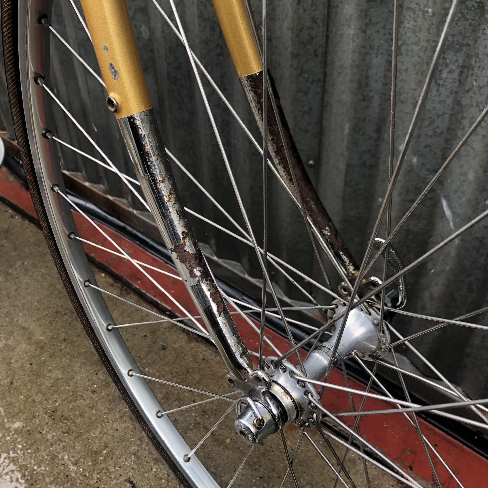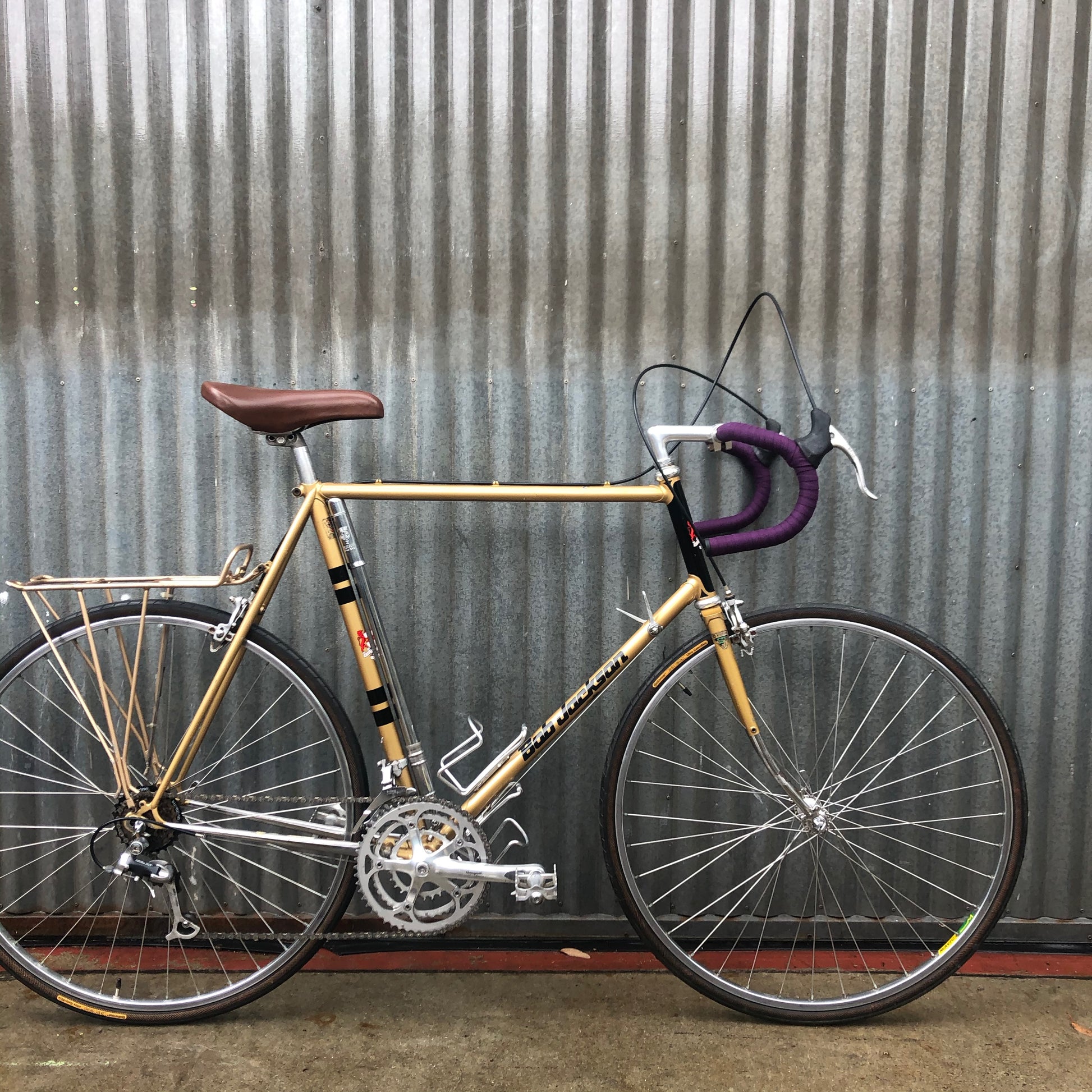 Bob Jackson sport touring project bike. Low rider fork braze-ons, neat Campy/Deore super wide range triple drivetrain. Appears to have had semi-recent service with Gatorskins and a newer Shimano freewheel. Cinelli cockpit. Chrome flaking from fork. Very early Chris King headset with crack in top cup. We cleaned up a little, tuned up, put on Newbaums eggplant tape. Spoke nipples are quite corroded. Reynolds 531.