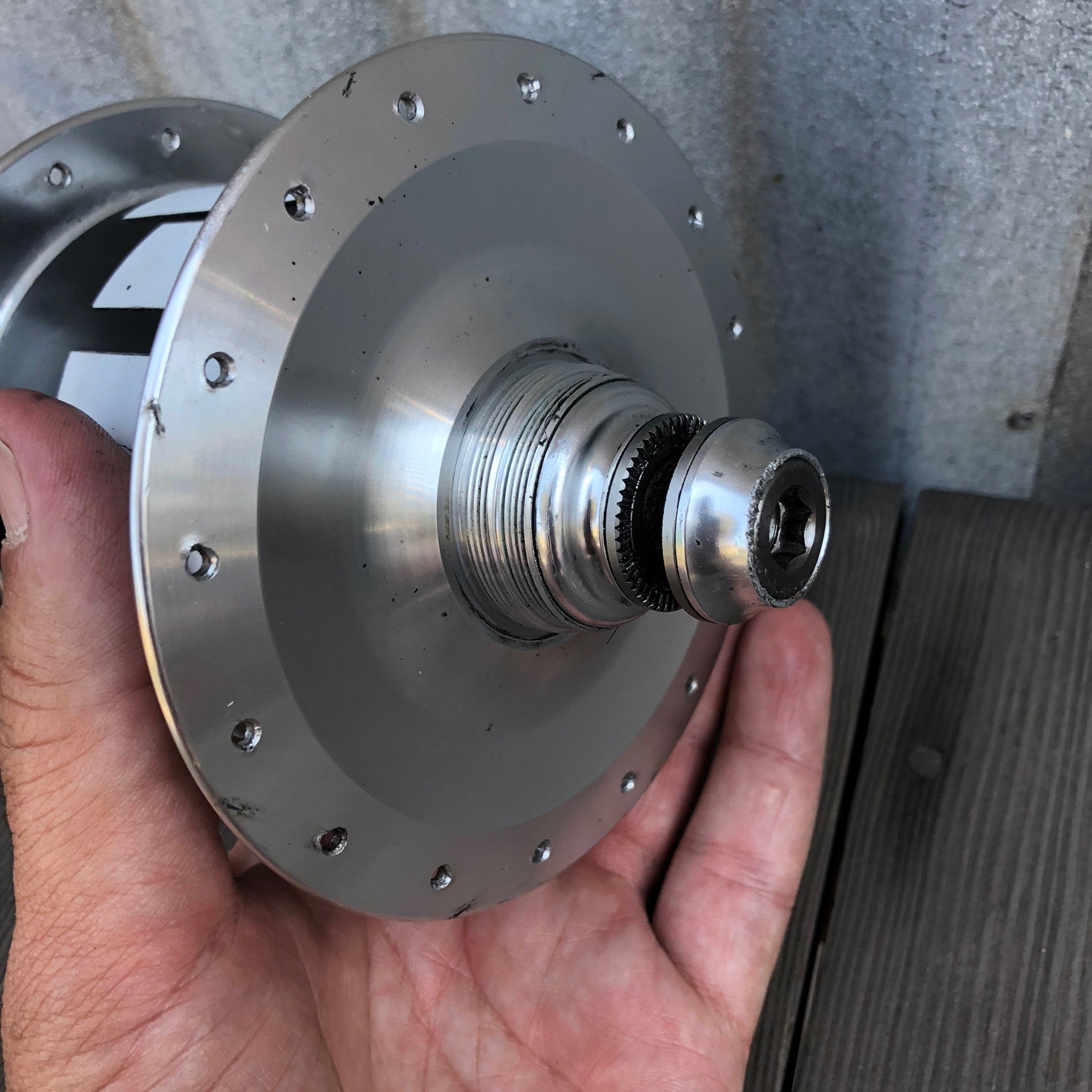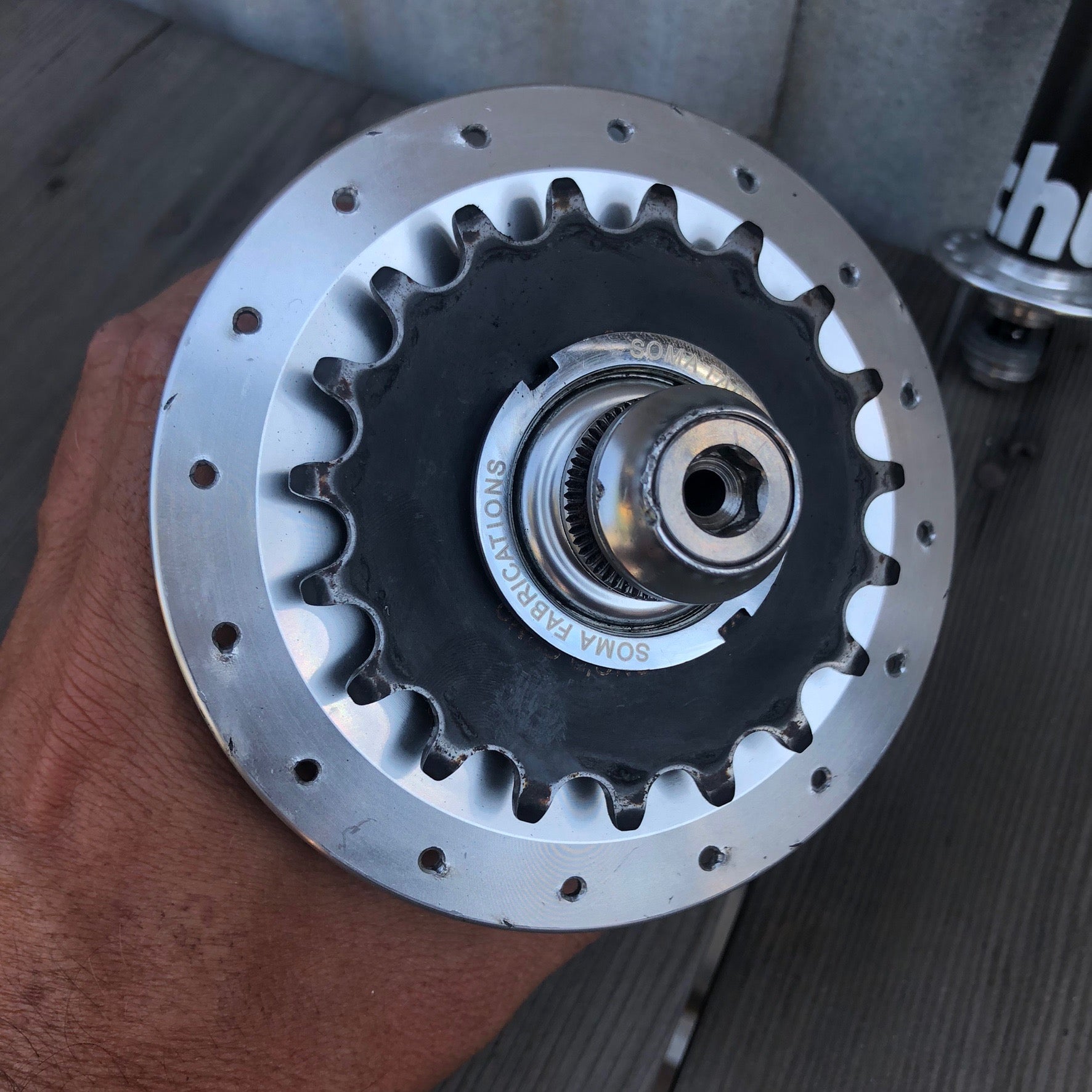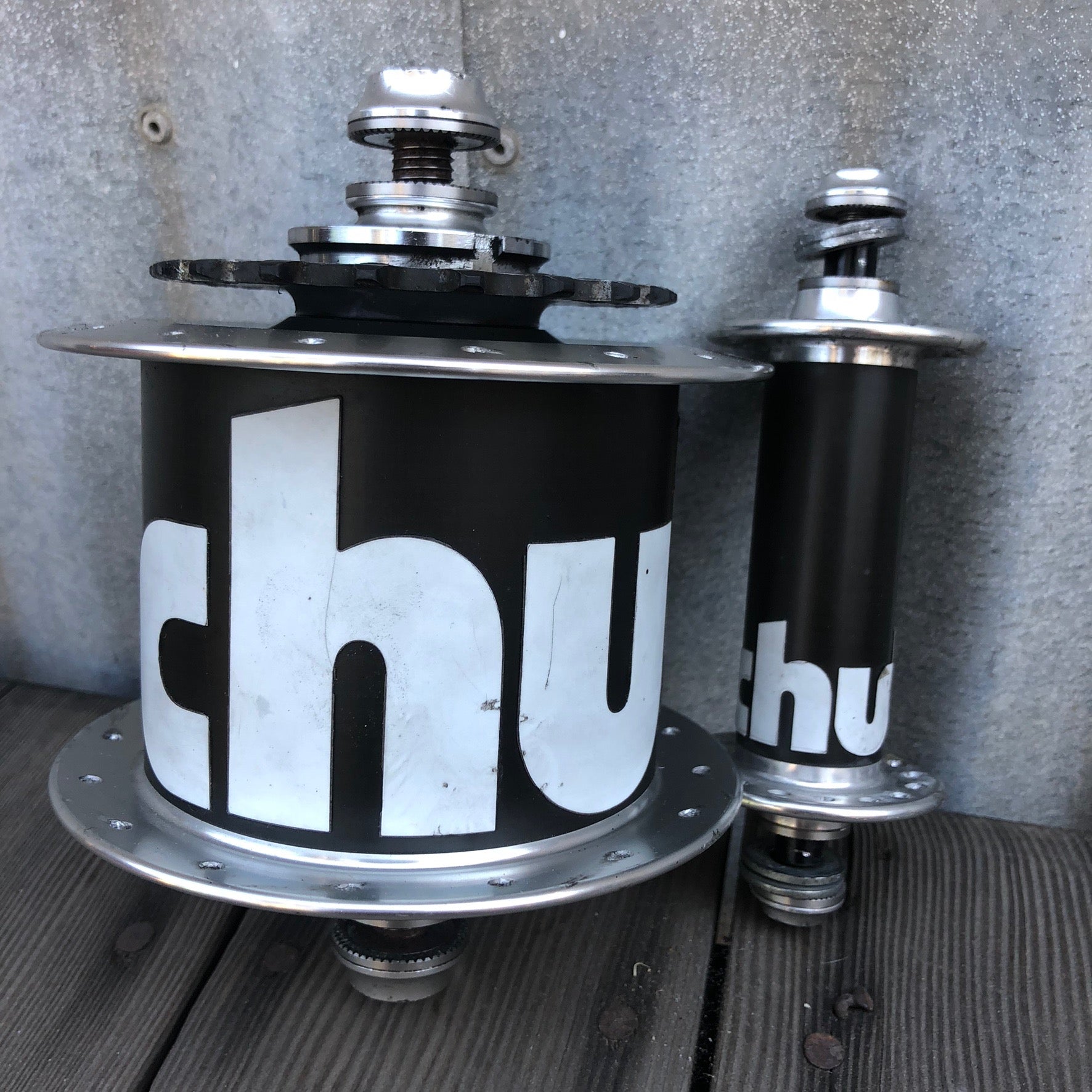 Coco's Fixie Nostalgia Inventory Update: 120 MM spaced Chub Hub set. Smooth rolling. 32 spoke. Arrived on a quite trashed set of pink Velocity deep V rims. Includes 19T Soma cog and lock ring (on finger tight.)