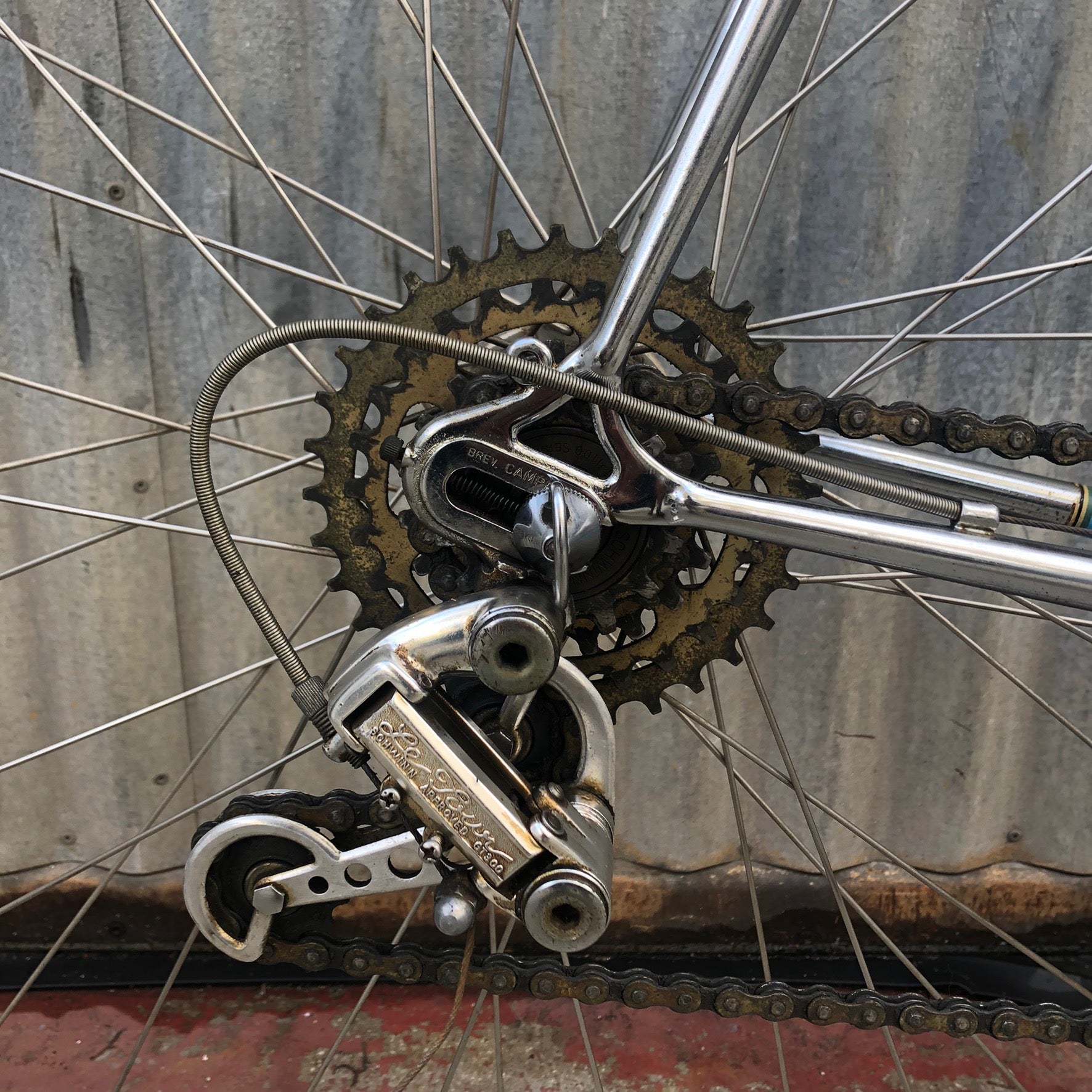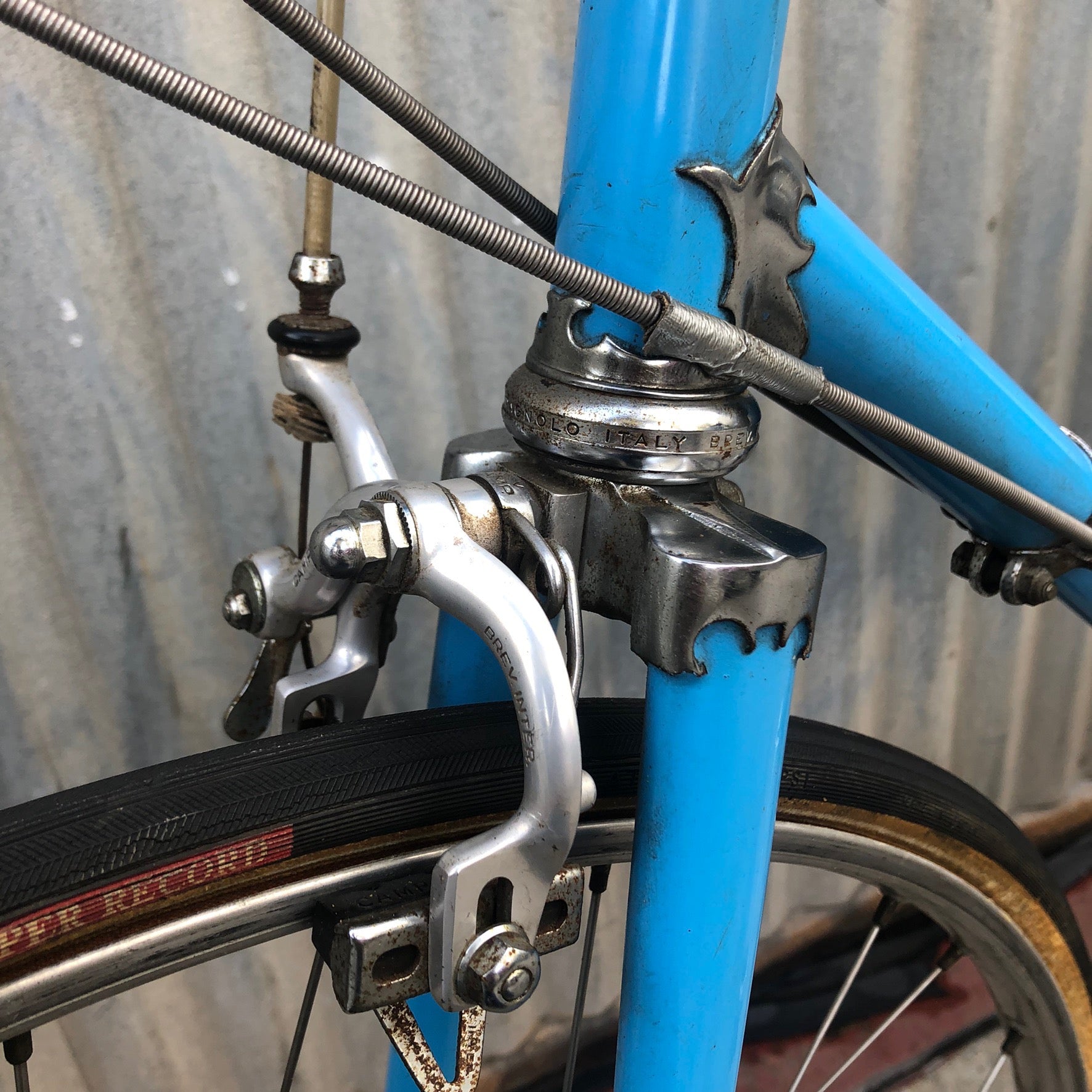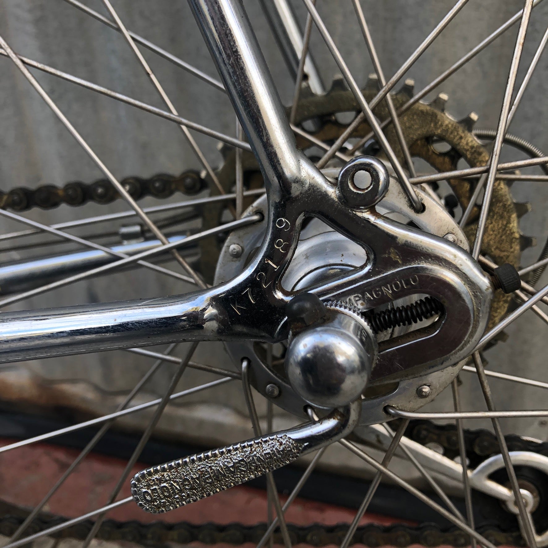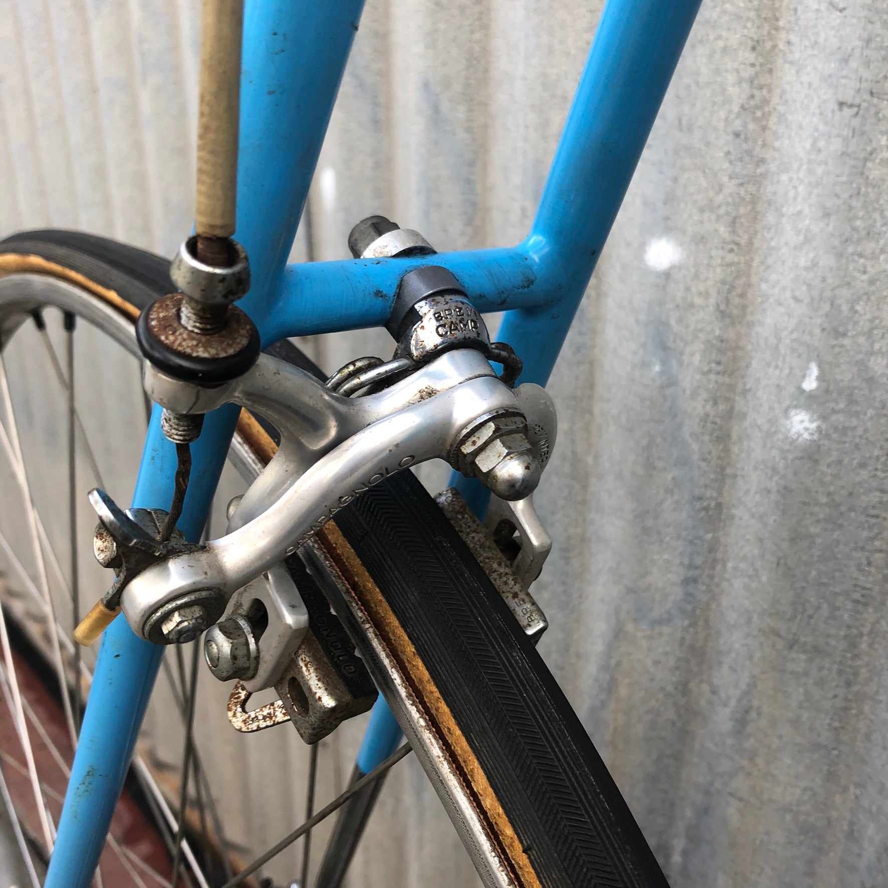 Campagnolo brakes with step down bolt at rear. Brake mounted inward to allow big saddle bag. Original Campagnolo brake pads