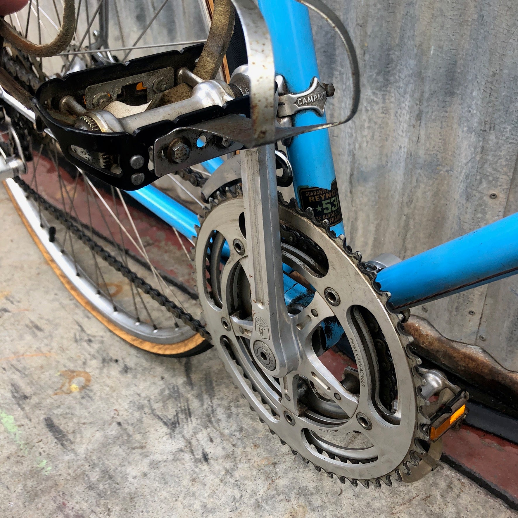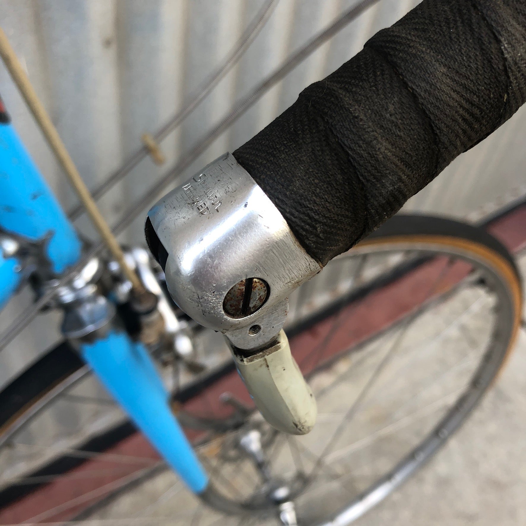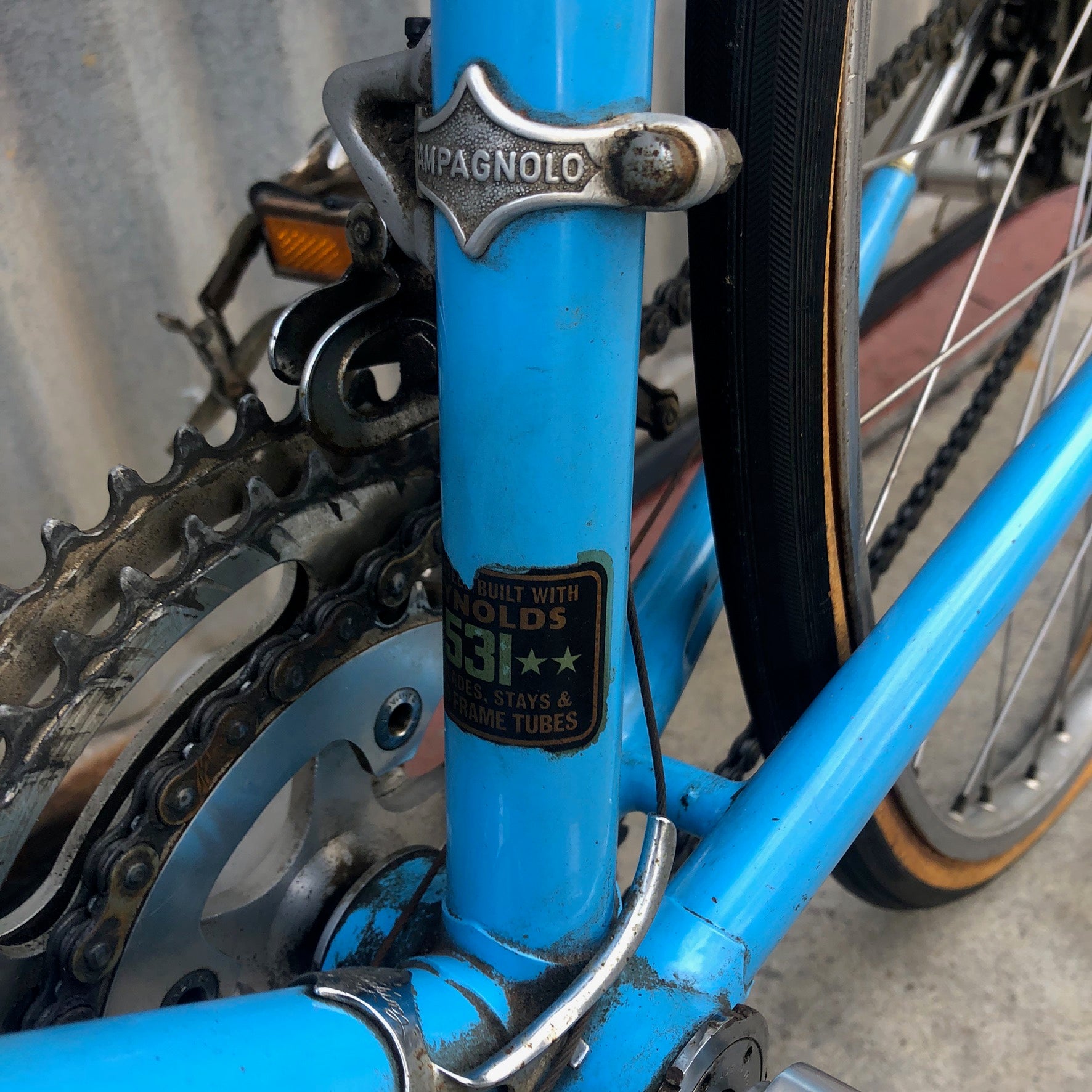 Campagnolo brakes with step down bolt at rear. Brake mounted inward to allow big saddle bag. Original Campagnolo brake pads