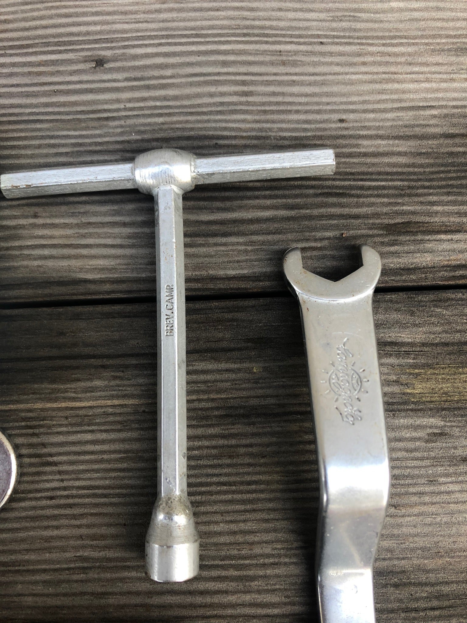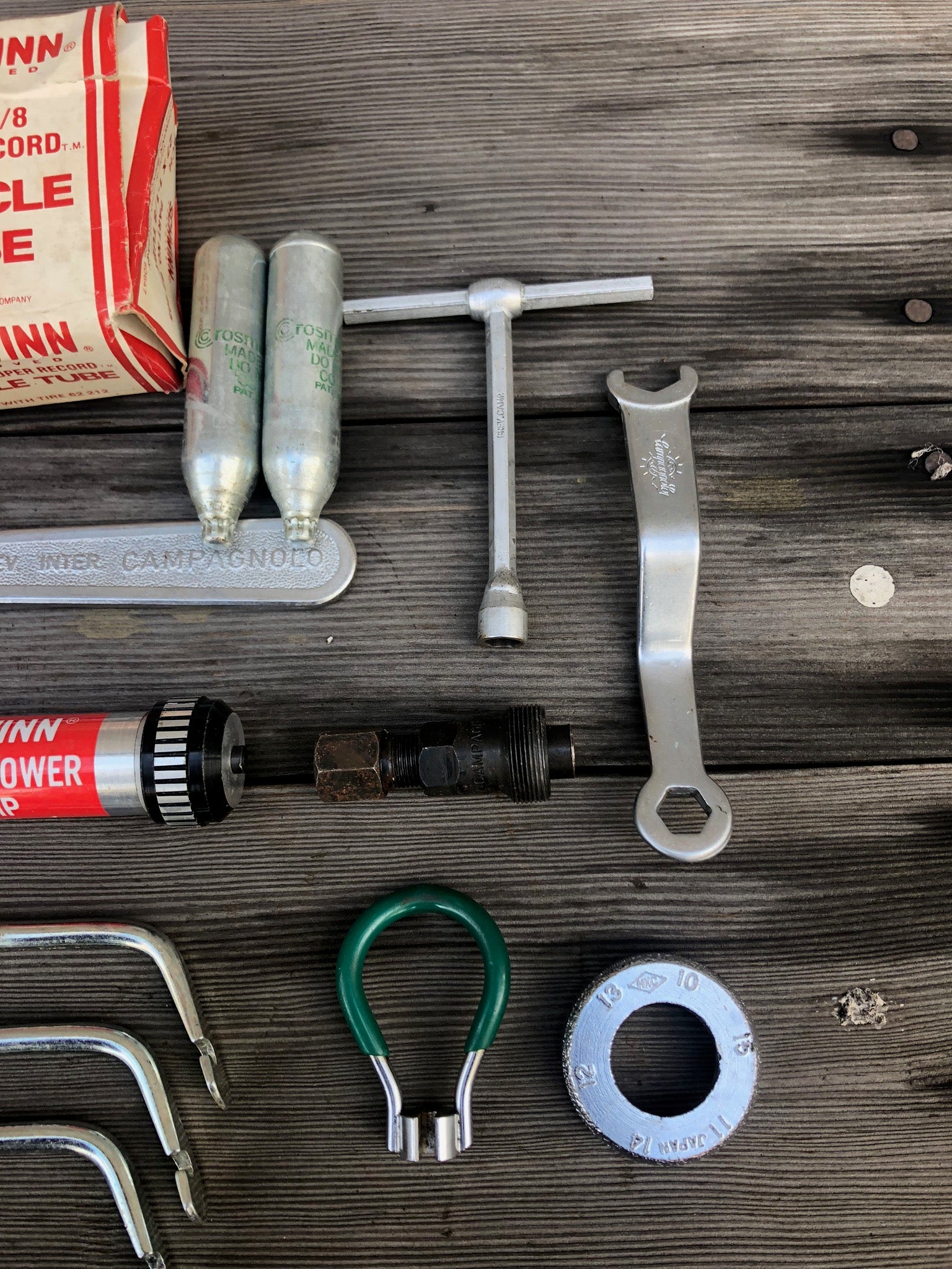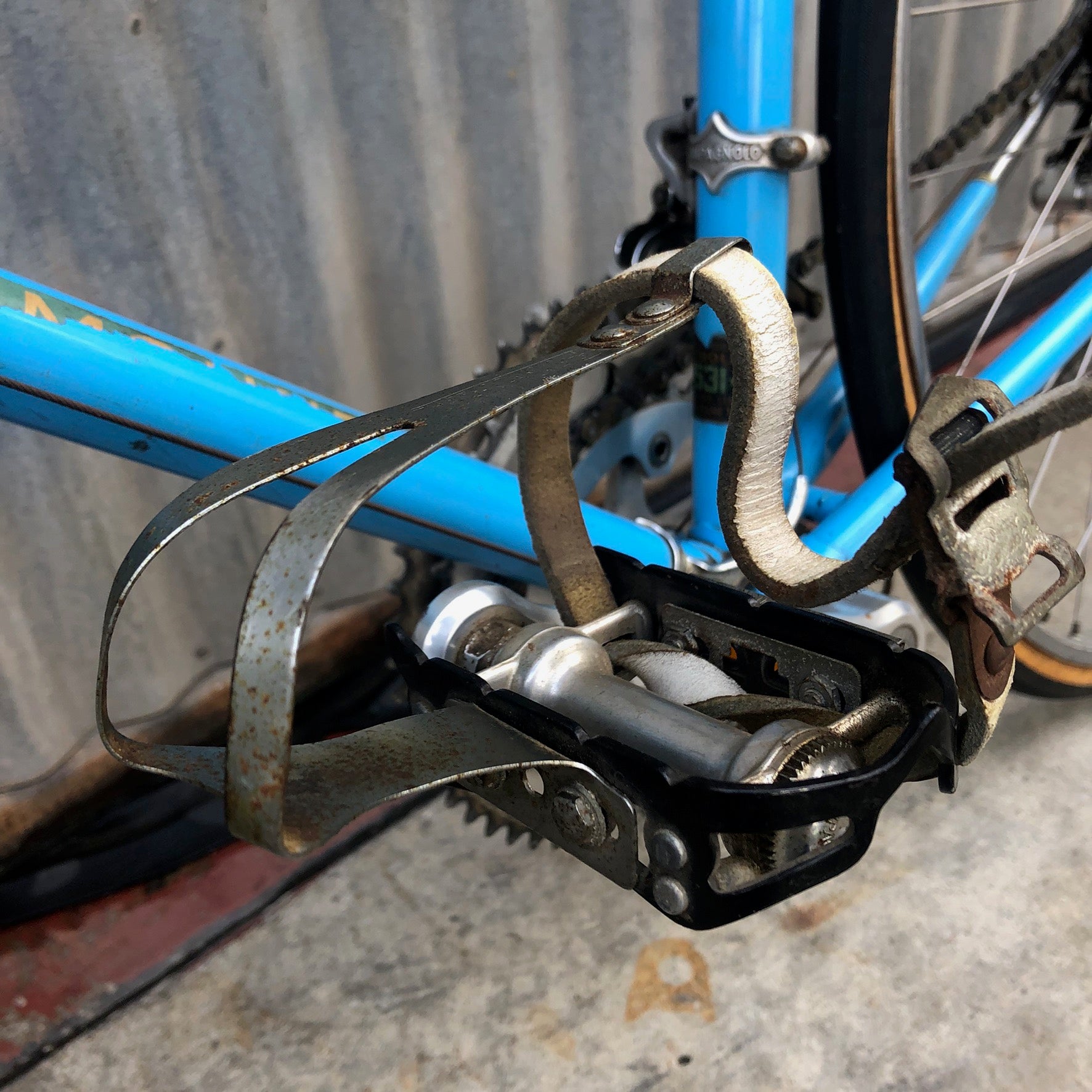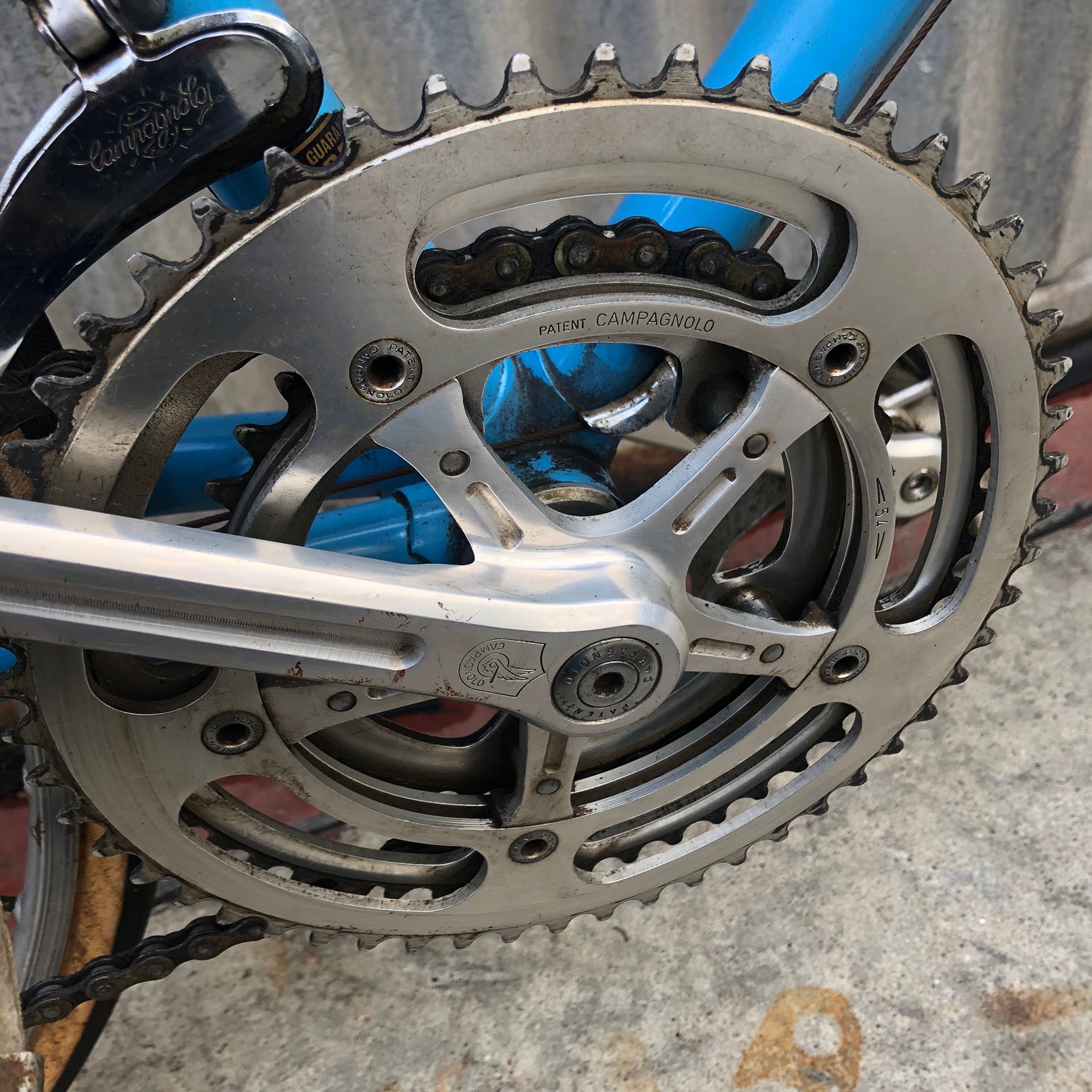 Campagnolo brakes with step down bolt at rear. Brake mounted inward to allow big saddle bag. Original Campagnolo brake pads