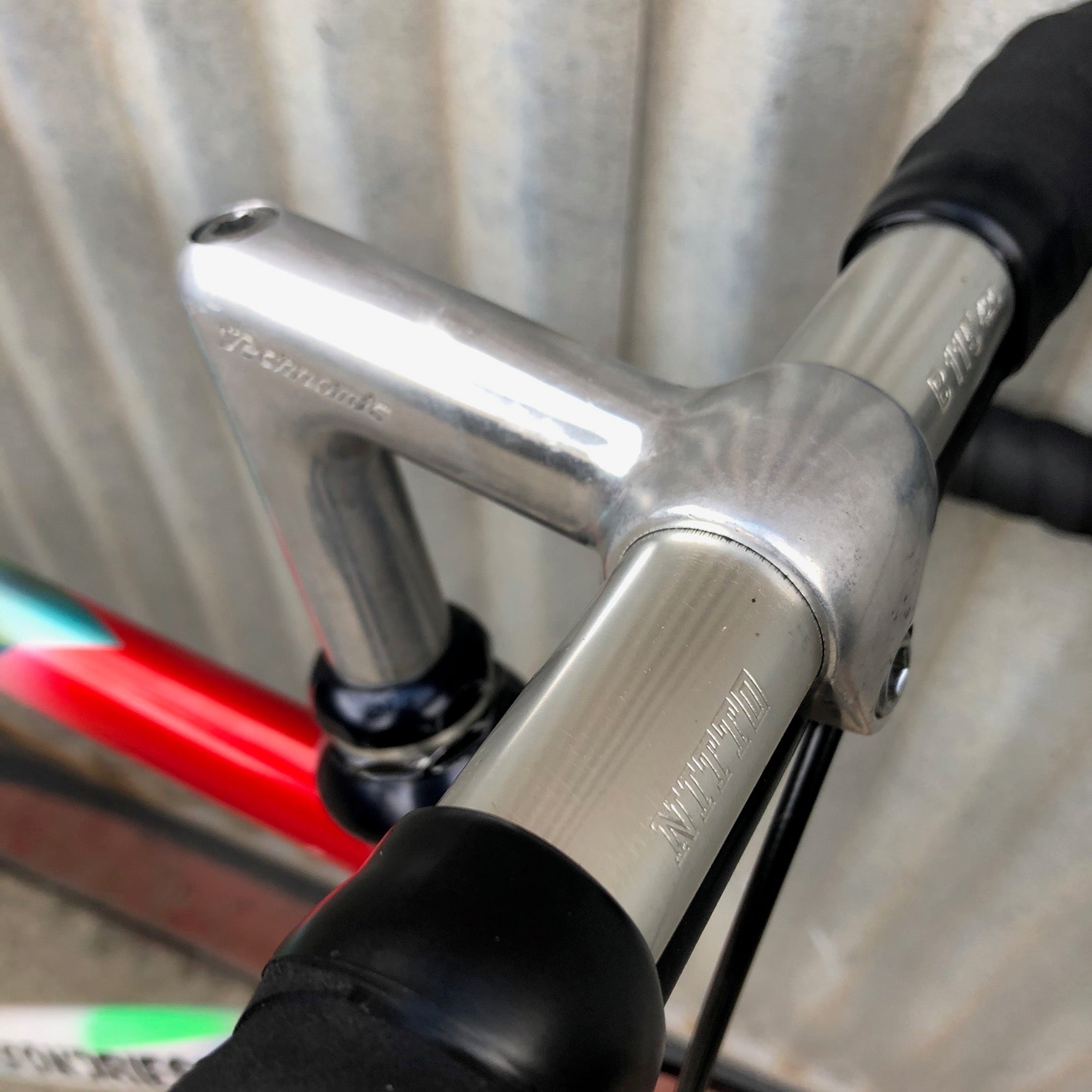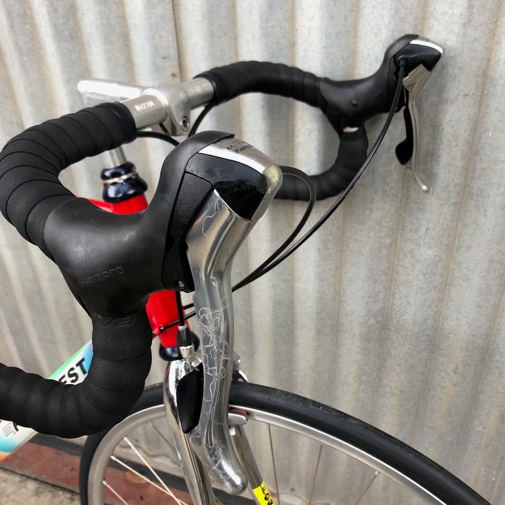 Came from Ian - former bike store employee in Bloomington — HOME OF THE CUTTERS! - which explains all the cool touches like the Ultegra 6600 hubs on Mavic Open Pros, Nitto bars, Technomic stem. Cool steel bike in outrageous outrageous-ness. So Italian! So Bella Bella! 57 CM $675 and so clean.