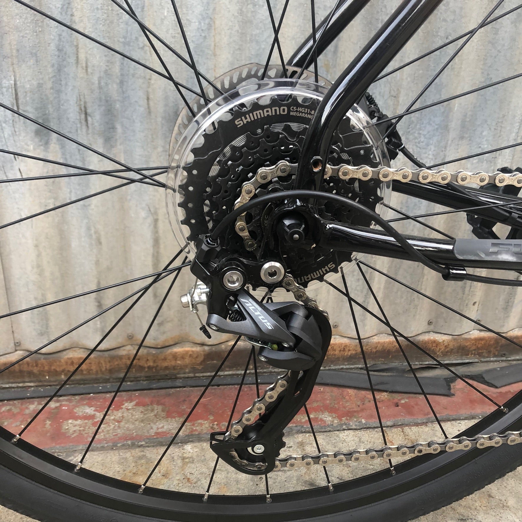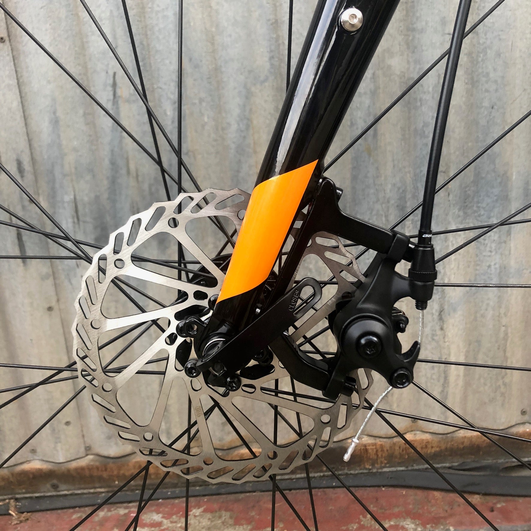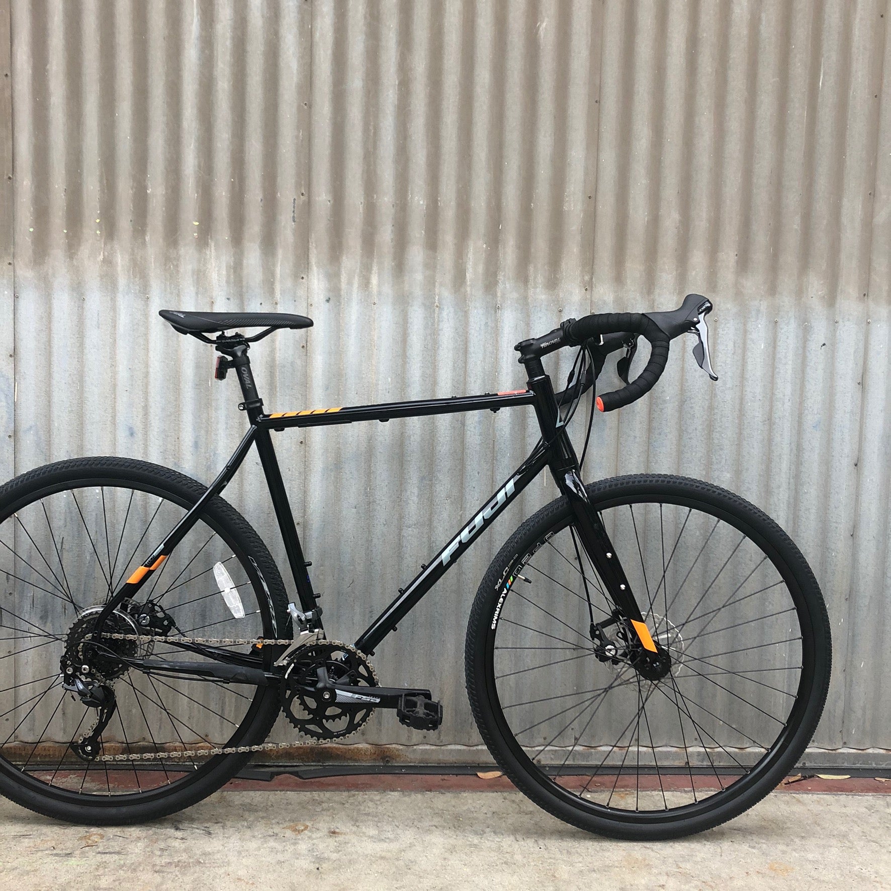 Fuji gravel touring rough stuff super commuter. Everything everybody wants except it is heavy. Pretty smart budget build with Claris shifters on a big cowbell bar with an Altus rear derailleur and big cassette. If you want to ride the fire roads to work and sometimes load a tent and can of beans, it is a reasonable choice. Good post-apocalypse bike. 56 CM New $799. Coco’s Crusader $549 barely used demo with a slightly mismatched (but brand new) front wheel and tire.