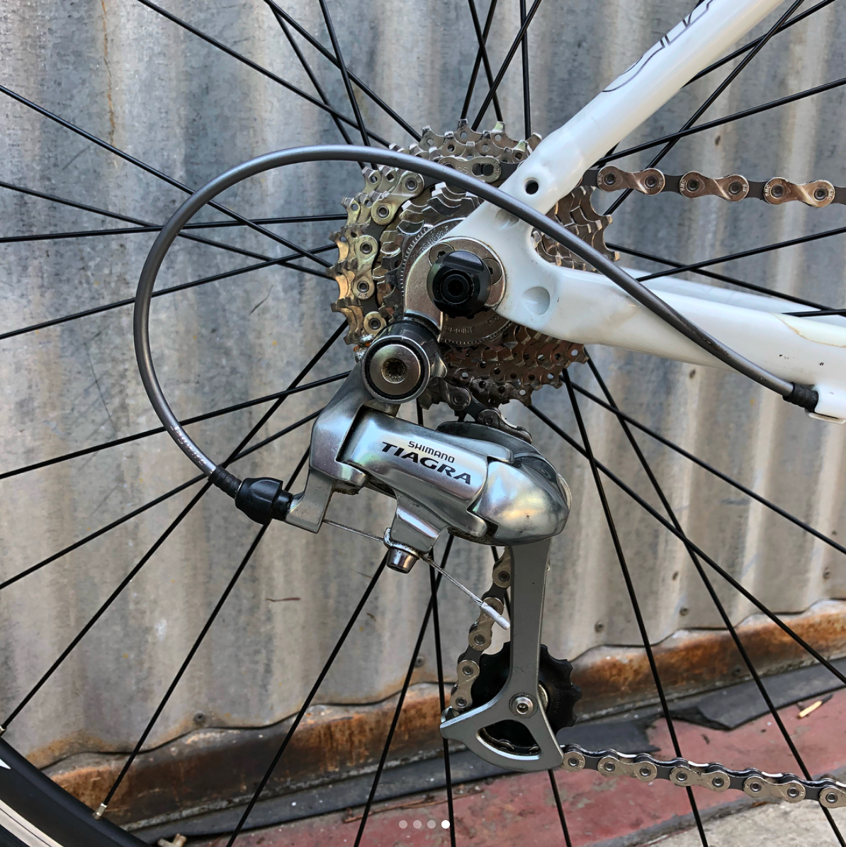 Hard to find, high quality, high spec flat bar road bike. Not an inexpensive hybrid, but a carbon fork, light alloy frame, true flat bar road shifter bike. Great bike. 3x9 Tiagra. These were $1000 in 2012. Well kept but ridden at beach so we replaced chain, really cleaned the chain rings, ultrasonic cleaned the cassette. New tires. Tuned and ready to go $495 with warranty.