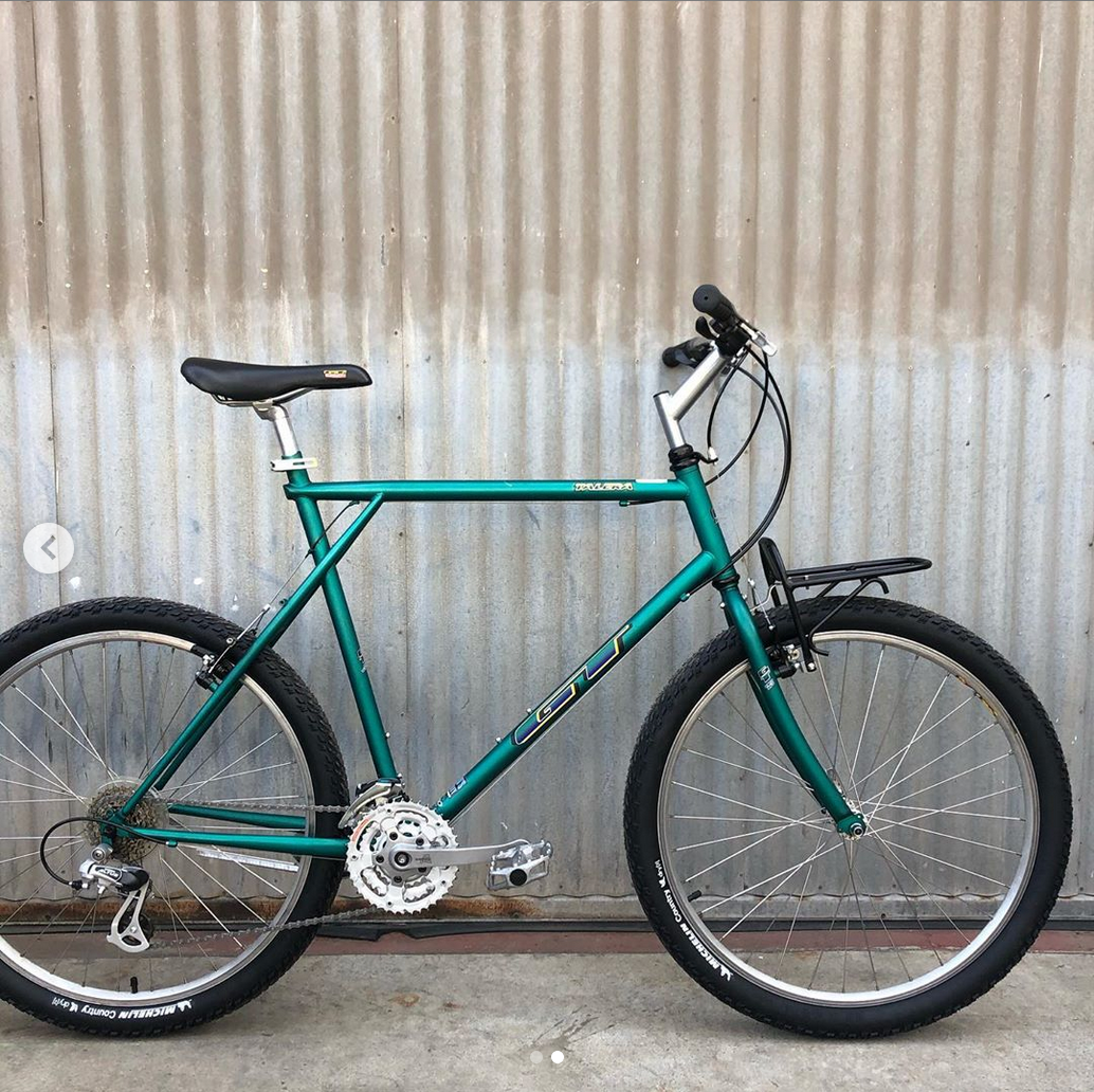 Why do we call them #hobocamper? They are low buck, high style, adventure bikes for the can of stew and hammock style of overnighter. Or city ride off curbs. Or 1980/90 style MTB madness. GT Talera triple triangle frame in a great electric forest green. New Michelin Country Dry tires and more modern Altus/Acera drivetrain. Fun! Large $435