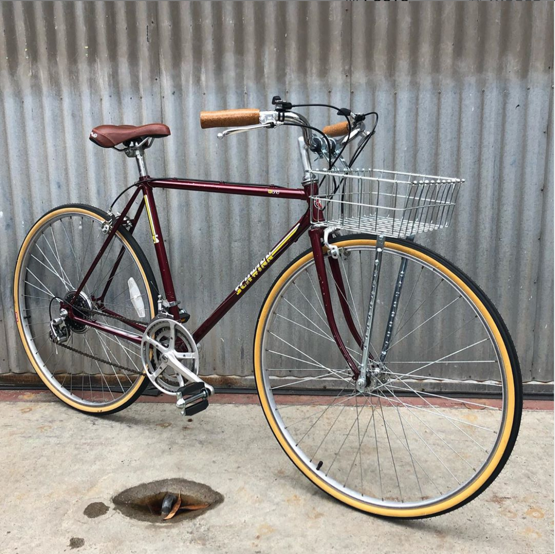 maybe you have lots of everything but what you needed the whole time was a classic city bike with a functional and attractive front basket. Schwinn World converted for carrying of cheap rosé, expensive bread and free library books. This summer’s hottest novel writes itself. Shellac’s cork grips, a North Road style handlebar, everyone’s (everyone on a budget) favorite thumb shifters, gumwall tires, comfy saddle, Cane Creek brake pads, full recable, made in USA Wald basket, rubber block pedals, Sunrace chain. 52 CM smallish medium