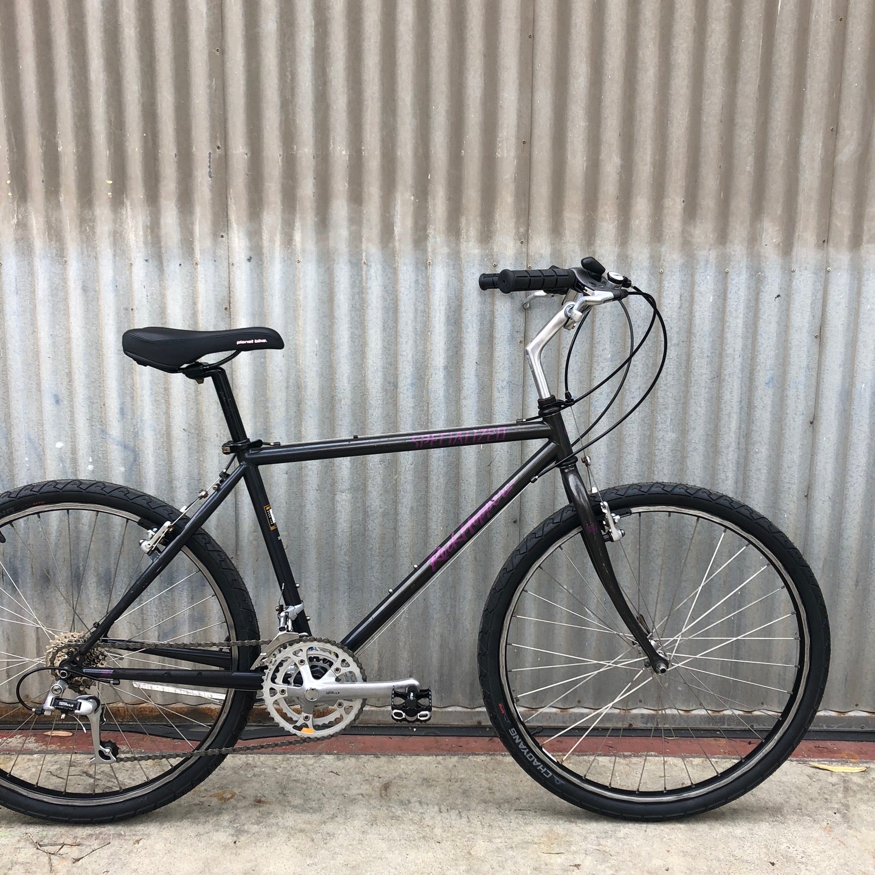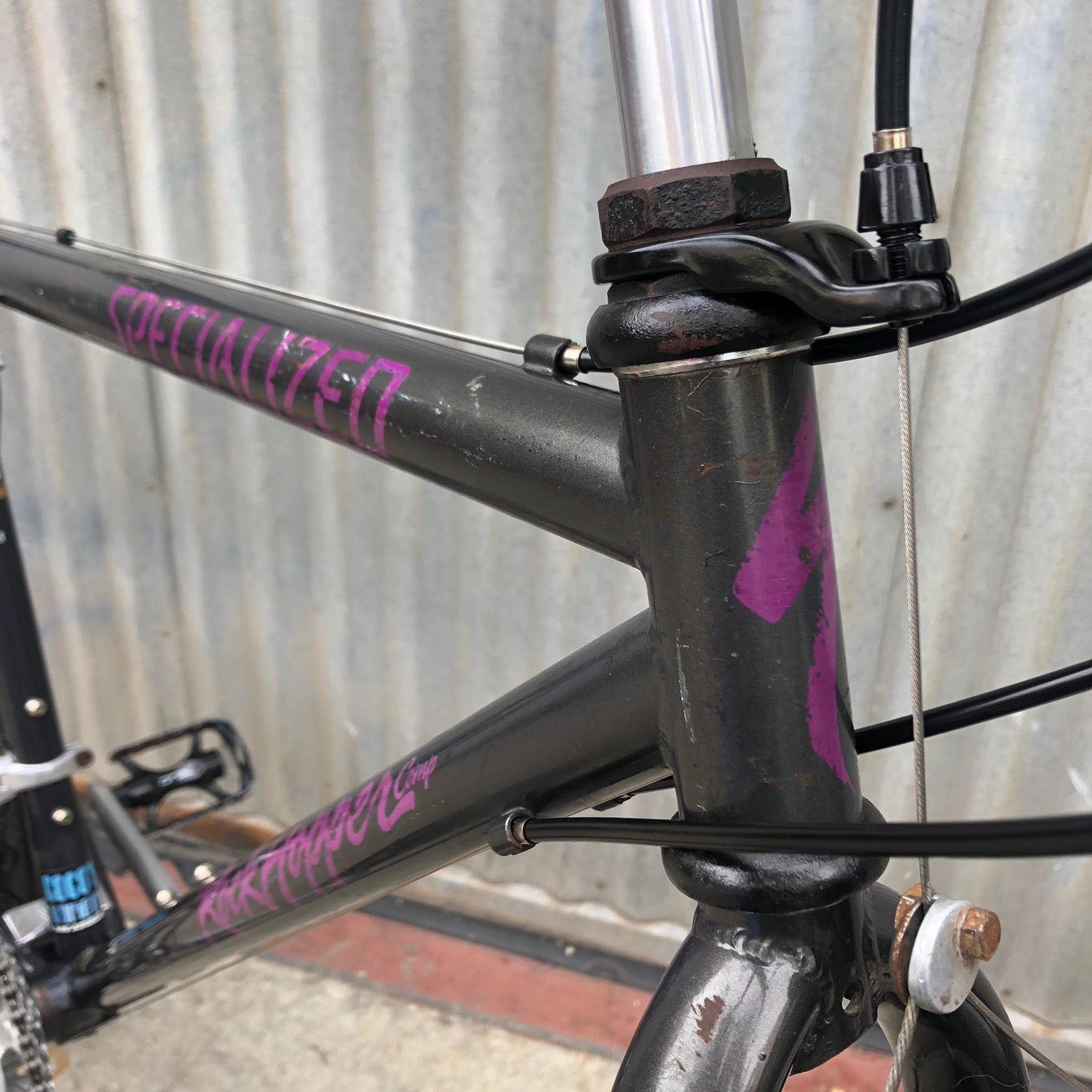 a little crustier than normal Specialized Rockhopper Comp that is not compromised functionally but a little tougher aesthetically and priced lower accordingly. Deore 7-speed indexed thumbies with new upright bar and stem. Still lots of new bits and all the effort. $380 18” Medium