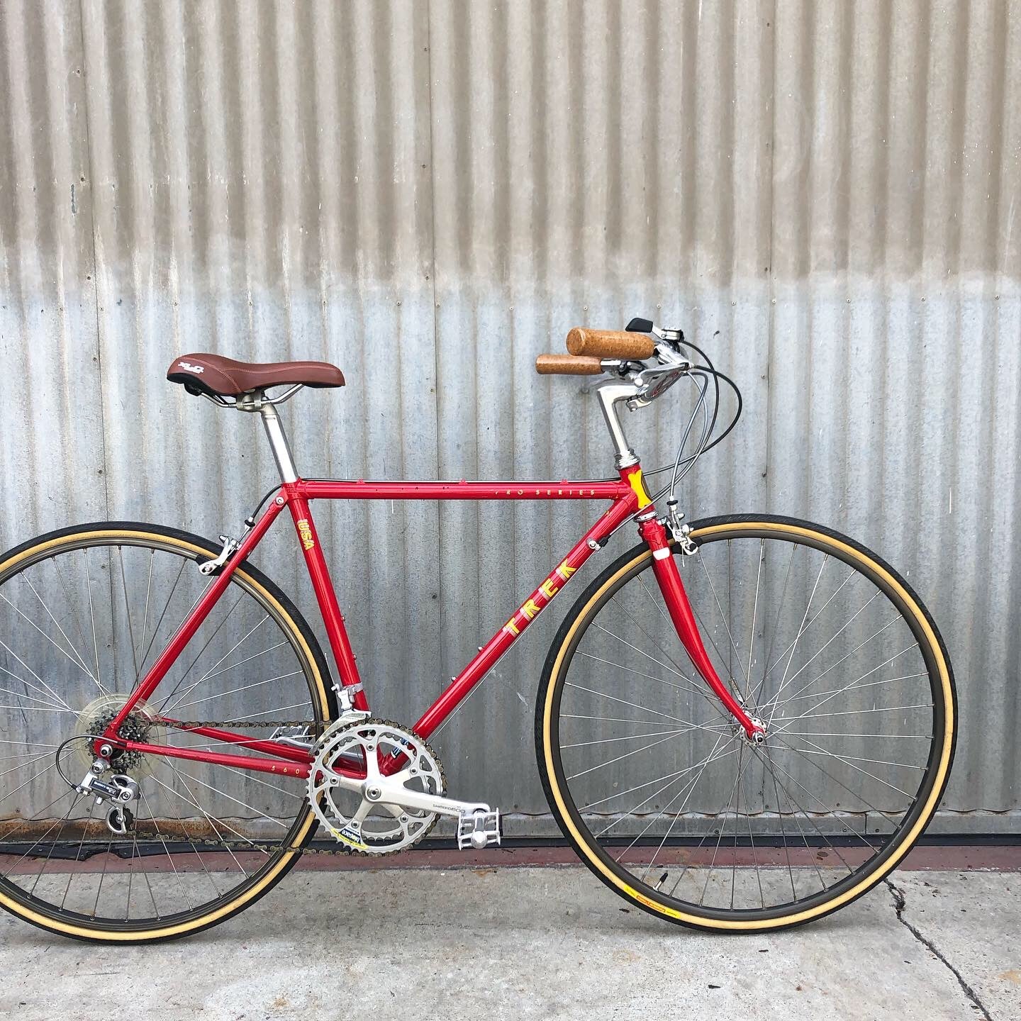 Coco’s Fast Baguette Inventory Update: arrived as a super cool #baguetteslayer from Albert 👋 and we built onto what he had done. As a cyclist, he was cool with the original down tube shifters, a long stem and a low rise bar, but we know many would prefer a shorter, taller stem and a bar with more rise. And when you get your hands higher, it is a longer reach to the downtube shifters so we swapped to Sunrace thumbies with Sunrace downtube stops. We swapped the rear wheel as the eyelets were pretty crusty and the front and rear are now mismatched but not annoyingly so. Trek 560, made in the USA, Reynolds 531. A terrific riding, very fast baguette procurement machine. 49 ST 53 TT $475