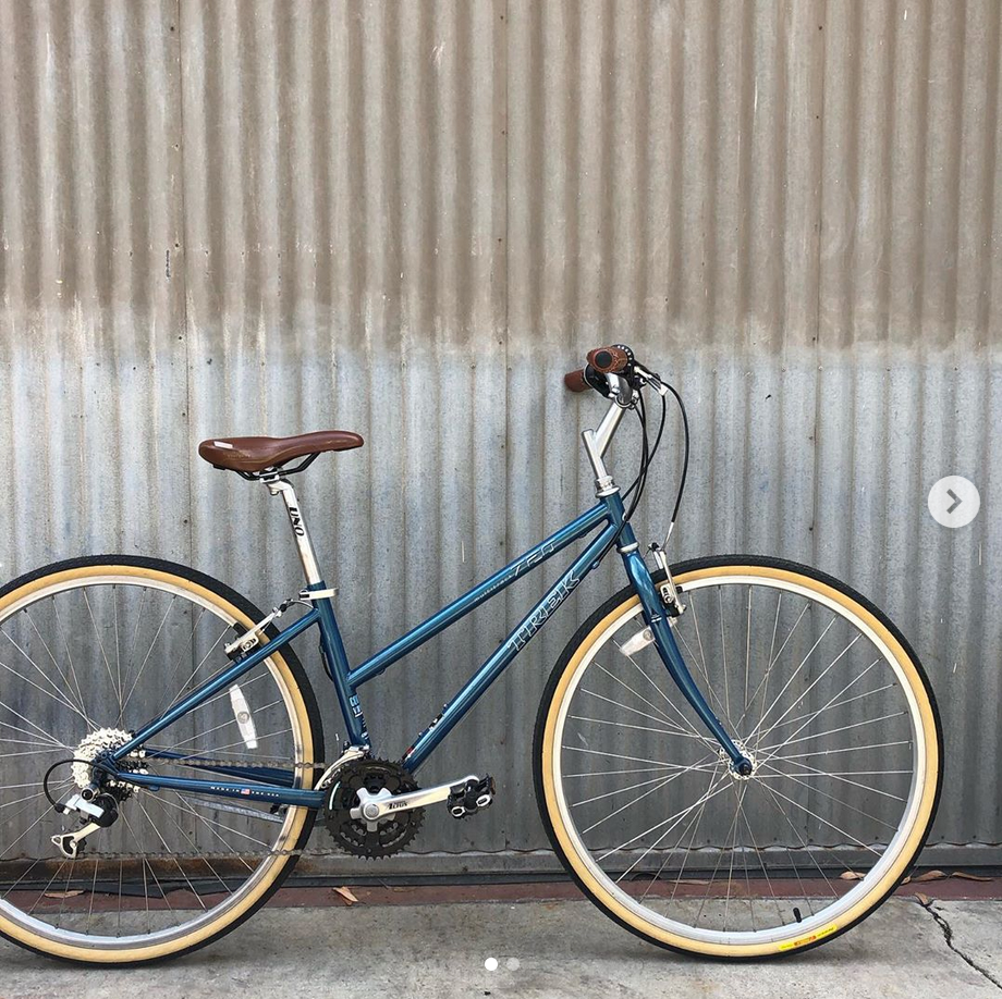 Nice build on a clean Trek stepthrough in a great color. New brown saddle, grips, Pasela Panaracer gumwalls and all the cool bits that make for a nice Coco’s bike. Small $390