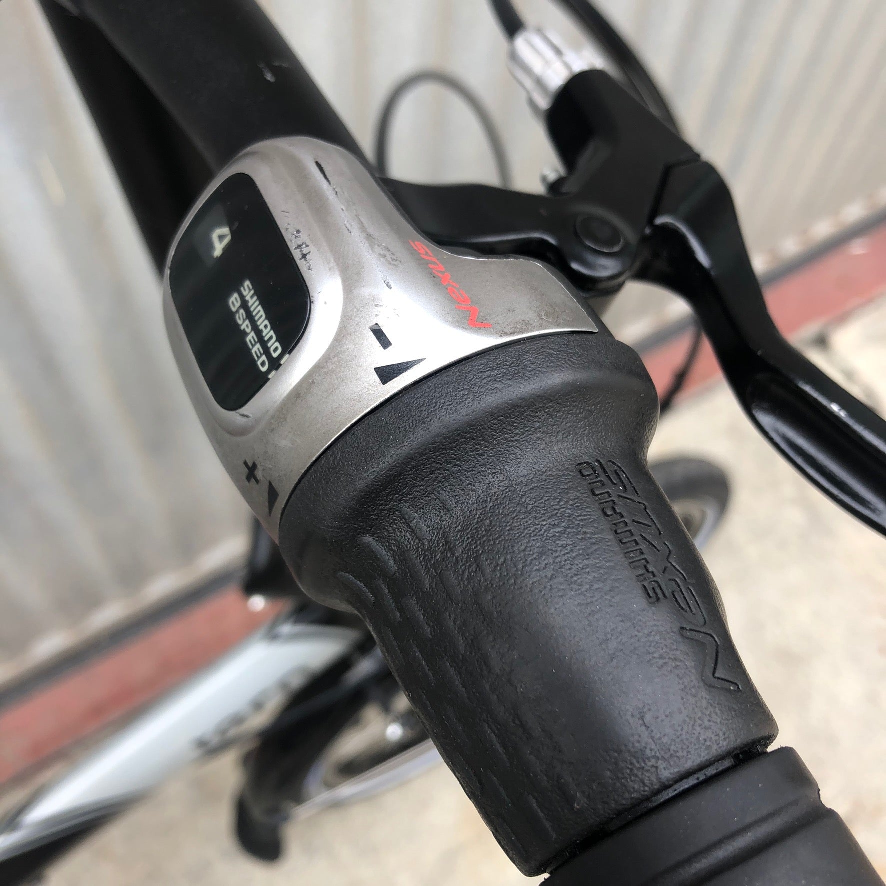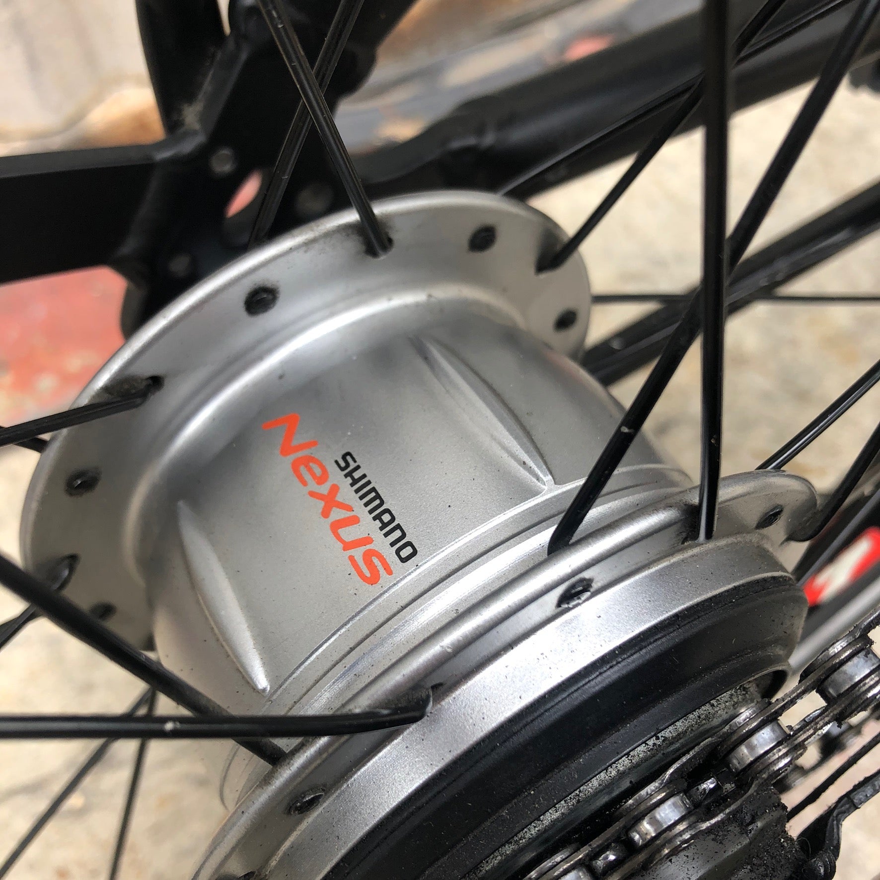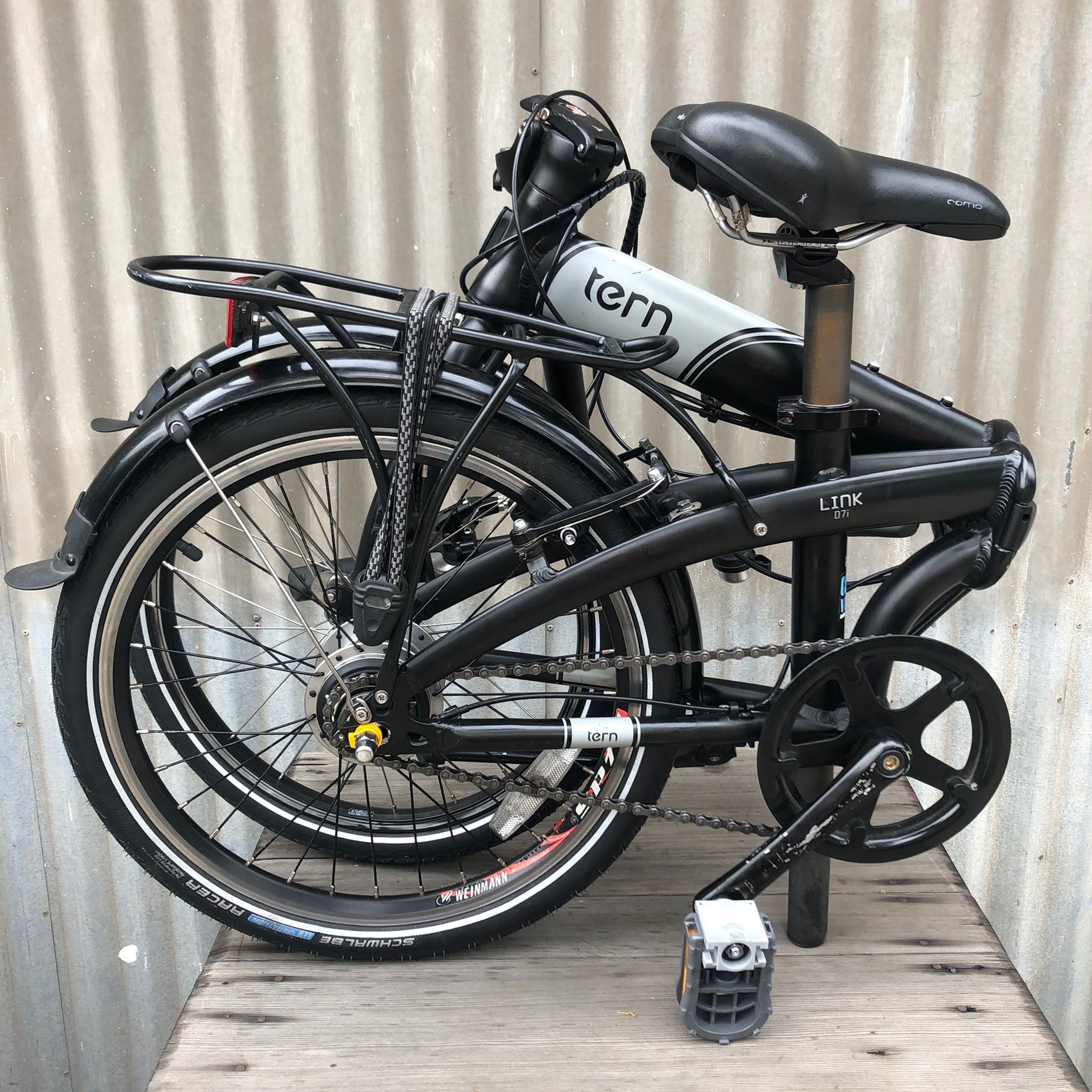 Tern 7Di folding bicycle with internal hub 8-speed Nexus shifting. Cheaper bikes have external derailleurs that get knocked out of adjustment or maybe a 3-speed internal hub. Rare to see this high end of a model. Nice condition. Had a newer Schwalbe Racer tire so we ordered a brand new matching Schwalbe for the front as it was a little dry cracked. We also put on brand new MKS folding pedals. Had a ton of stickers on it but now it is super clean.