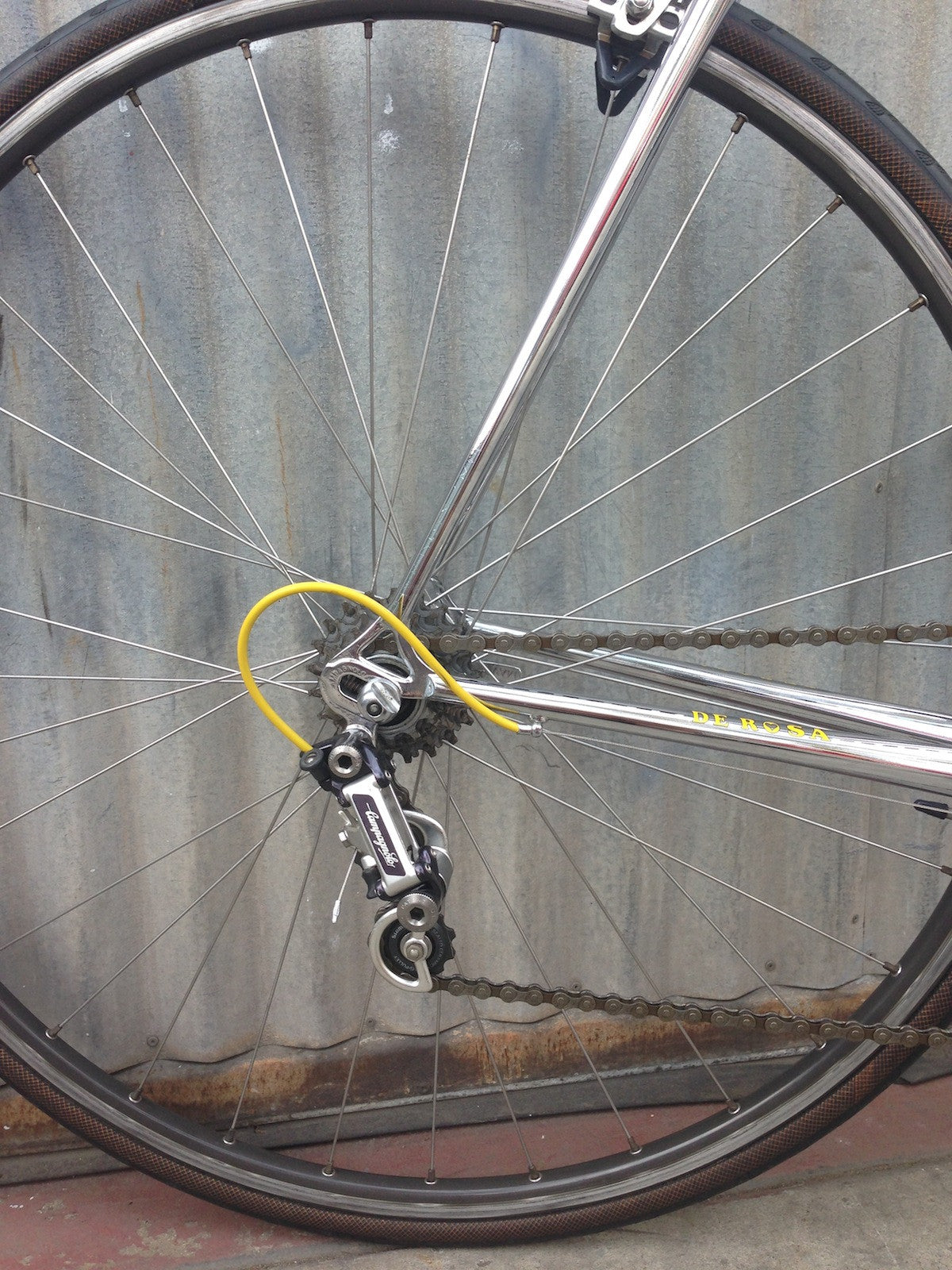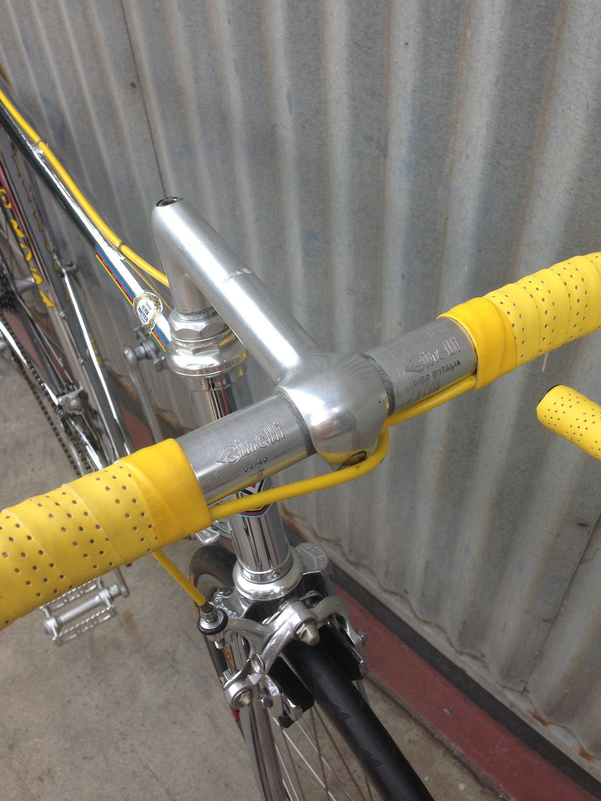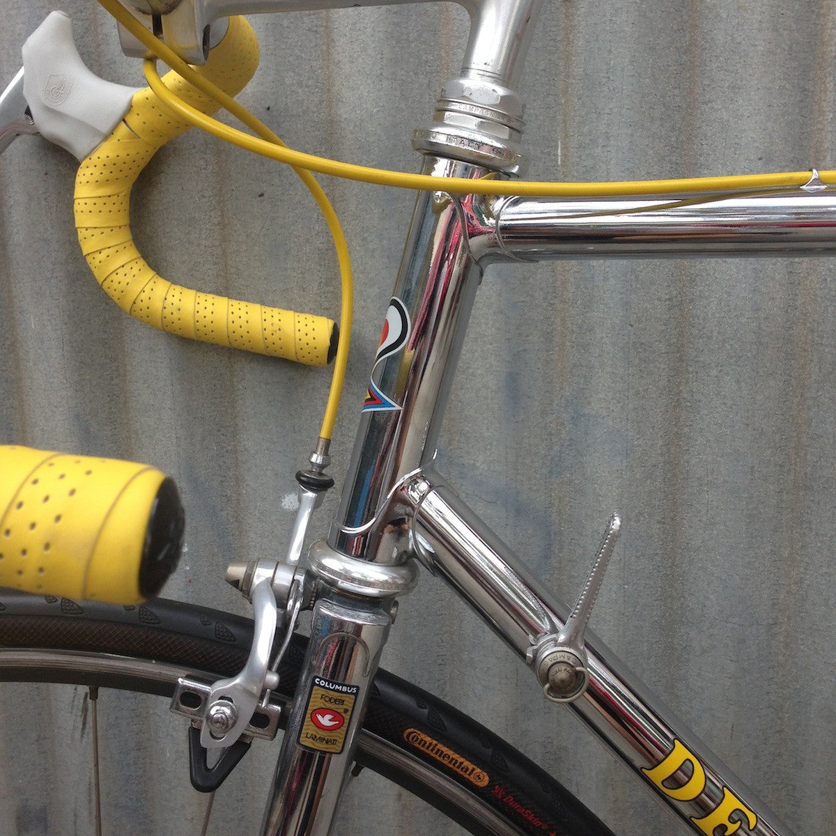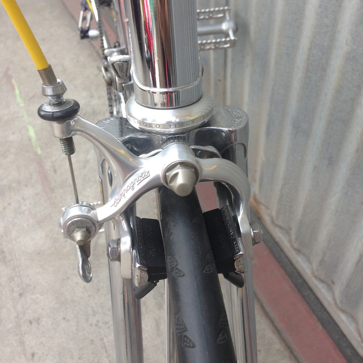 This classic early-mid 80s DeRosa road bike comes fully equipped with Italian Campagnolo components...but more importantly, it's fully equipped with Italian style and flair. The frame and fork have been re-chromed, new decals applied and the bike has been completely rebuilt with many new components. Campy Super Record group (with C-Record brake levers). Cinelli 1A stem (130mm) with Cinelli Giro d'Italia bars (40cm). Mavic hubs laced to Open 4CD clincher rims. While it isn't a "show bike", it is a lovely rider that presents very nicely. Decals have not been clear-coated and there is a slight "lift" in a couple of locations. Still MUCH nicer looking than the torn up peel-and-stick panel decals that it showed up with!
