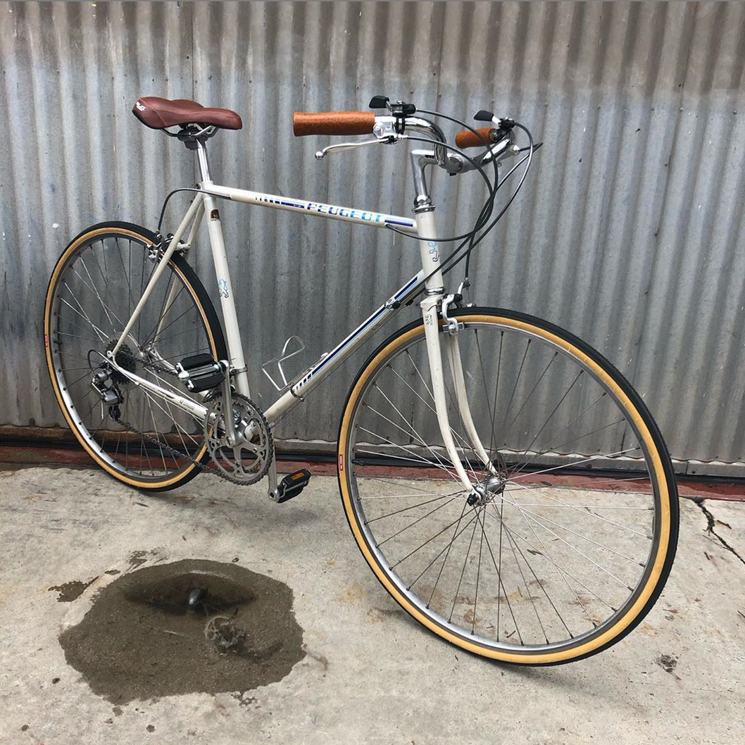 Peugeot road bike that has a bar swap, down tube stops and thumb shifters. Add a little Wald basket - wow! Much new like shellac’d cork grips, gumwalls, saddle, et al. 56 CM medium $395