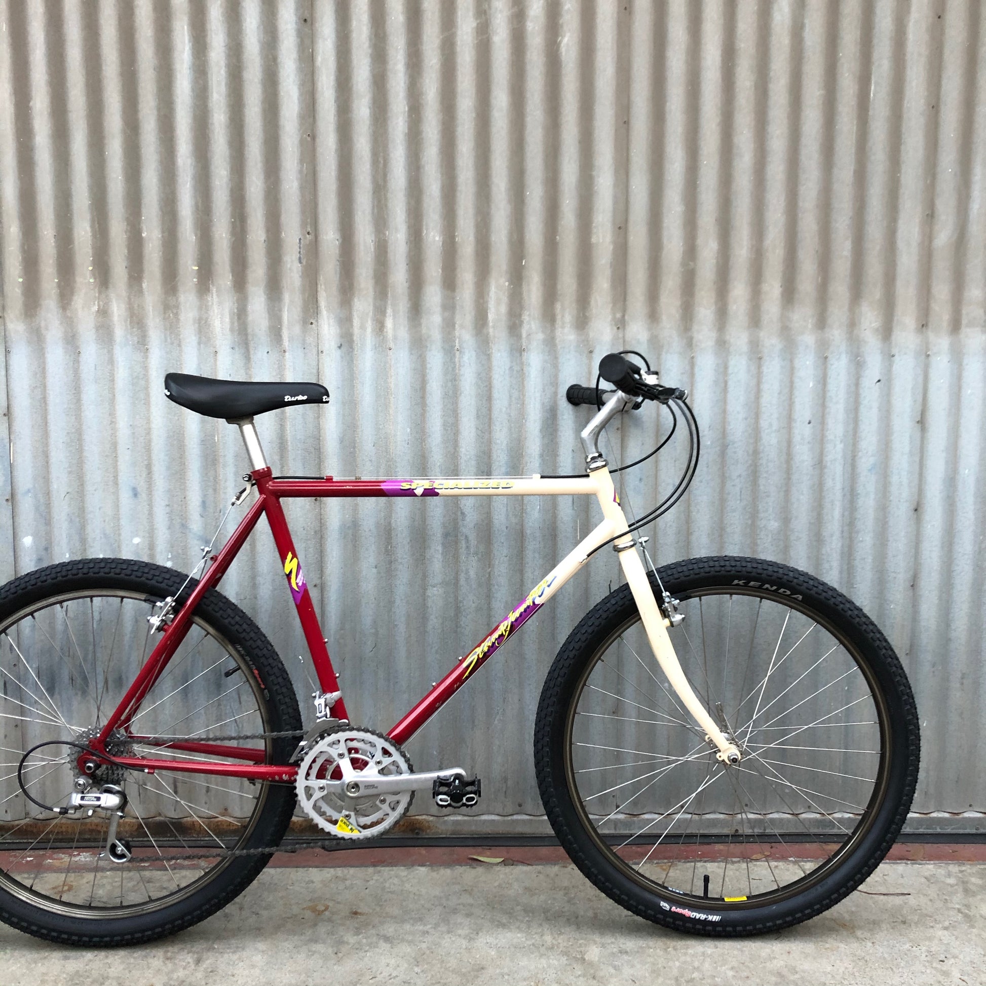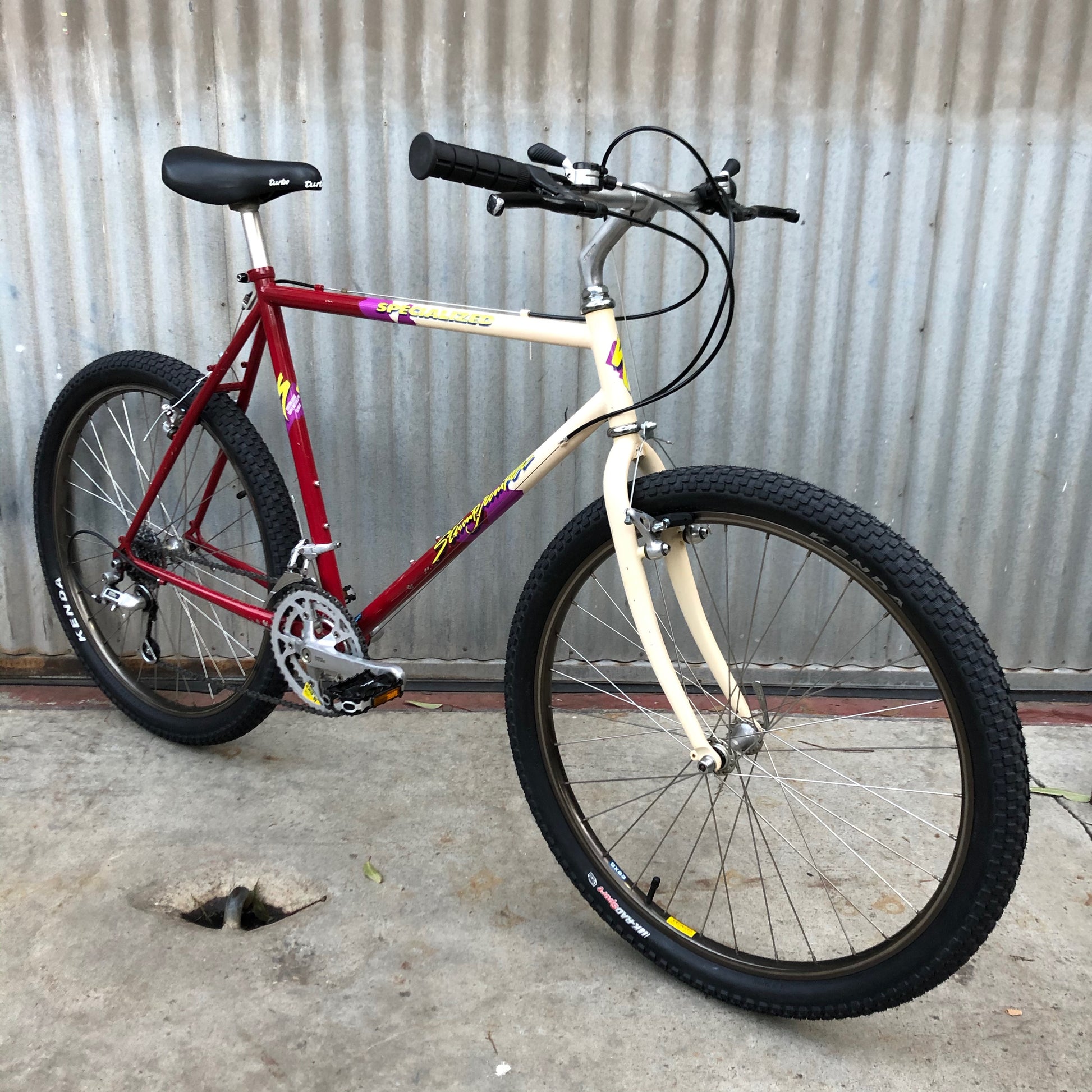 Remarkably clean vintage Specialized Stumpjumper. The neon bits on the decals are usually faded but still quite bright in this example. Arrived with black stem/bars, now with fairly era correct Specialized branded Nitto bar and stem. Full frame up build. 22” $550 Is the Turbo too hard? Is $550 too much? We will knock off $25 and put on a standard saddle or knock off $35 and put on your saddle.